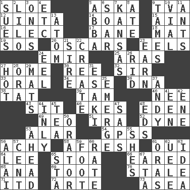 ACROSS 1. _ gin 5. "____ silly question..." 9. Federal power corp. 12. National forest in Provo, Utah 14. Water vessel 15. The 18th letter of the Arabic alphabet 16. Opt 17. Object of repulsion 18. Floor covering 19. Mayday 20. Motion picture awards 23. Snakelike fish 24. Independent ruler or chieftain 25. Ancient river in northeast Turkey 27. Dwelling 30. To separate or throw off 32. Title for a knight 33. Taken by mouth 34. Relaxation 36. Heredity factor (abbr.) 38. Make lace 39. Scottish cap 40. Born 43. Be seated 46. Makes supply last 48. Genesis locale 49. Modern: prefix 51. Lyricist Gershwin 52. Unit of force 53. Having or resembling wings 54. Global Positioning Systems (abbr.) 56. Painful 58. Anew 61. Fr. "Yes" 64. Area sheltered from the wind 65. Portico 66. Having ears or earlike features 68. Santa ___, CA 69. A blast of a horn 70. Having lost freshness 71. It would 72. Johnson of "Laugh-In" 73. At sea DOWN 1. Takes to court 2. _ and Stitch 3. Singles 4. And so on (abbr.) 5. Swedish rock group 6. Fly high 7. Sunflower state 8. Had dinner 9. Makes less strong or intense 10. Small bottle 11. Pismires 13. Tiny particle 21. Beget 22. Make 23. Merit 24. Snakelike fish 26. To free from 27. Being at a high temperature 28. Mouth or opening 29. Floor coverings 31. 1973 Nobel Price Winner (Physics) Leo 35. Develop 37. Actor Griffith 41. Car or cant ending 42. Compass dir. 44. Inwardly 45. Afternoon social gathering 47. Plant excrements 48. Begley and Asner 50. Speaker 53. Having the leading position 55. "______ My Girl" (Turtles hit) 56. Mountain range southwest of Kyrgyzstan 57. Penny 59. Pick up the tab 60. Pace 61. Mouths or openings 62. Ubangi River tributary 63. The content of cognition 65. R.R. building 67. _ moment's notice (2 wds.)
