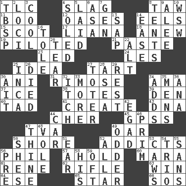 ACROSS 1. Affectionate concern, for short 4. Volcanic refuse 8. The 23rd letter of the Hebrew alphabet 11. Surprise greeting 12. Fertile tracts in a desert 14. Snakelike fish 15. Highlander 17. Climbing, woody, usually tropical vines 18. Afresh 19. Manned the helm 21. Thick mixture 23. Directed 24. French article 25. It may be bright or harebrained 27. Small pie 30. Black tropical American cuckoo 31. Full of chinks, cracks, or crevices 34. Housemaid (var.) 37. Frozen water 38. Hauls 39. Lair 40. Small amount or degree 41. Make 43. Heredity factor (abbr.) 44. "Mermaids" star 45. Global Positioning Systems (abbr.) 47. Federal power corp. 49. Rowing implement 50. Dinah or Pauly 52. Inveterate users 56. Silvers or Donahue 57. Hold, grip (Informal) 60. Hindu Mythology: god of death 61. French philosopher Descartes 62. Firearm 63. Victory 64. Compass dir. 65. Play the lead 66. Distress signal DOWN 1. Cook's measure (abbr.) 2. Locales 3. Calm and collected 4. Having a sole or soles 5. Put down 6. White ___ sheet 7. Commissioned mil. rank 8. Portable shelters 9. Toward shelter 10. Compass dir. 13. Plant excrement 14. Comfort 16. Lacquered or enameled metalware 20. Separate forcefully 22. The first octave above the treble staff 25. South American Indian 26. Passed on 27. Carrier 28. Toward the sea 29. Take ten 30. Small island 32. Hankering 33. Greater amount 34. Sums up 35. Not women's 36. Santa ___, CA 42. Mild oath 44. Automobile 46. Demure 47. One or ones belonging to thee 48. Grand slam 49. More peculiar 50. "______ My Girl" (Turtles hit) 51. Hearing organ 52. Silent film actress Nazimova 53. Crow sounds 54. Musical group of three 55. Without 56. Before (prefix) 58. Part of HMS, perhaps 59. Often (poetically)