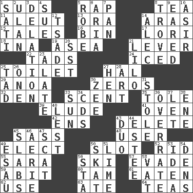 ACROSS 1. Beer foam 5. Reproach for some lapse or misdeed 8. Afternoon social gathering 11. Native American of Southwest Alaska 13. Mouth or opening 14. Ancient river in northeast Turkey 15. Lies 16. Storage container 17. Australian parrot (variant) 18. _ tizzy (2 wds.) 19. Toward the sea 21. Prying instrument 22. Bits 24. On the rocks 25. Bathroom plumbing fixture 27. Actor Linden 29. Small Philippine buffalo 30. Nothings 32. Gouge 33. Aroma 35. Lacquered or enameled metalware 39. Evade 41. Baking chamber 42. Followers of ems 43. Erase 45. Backtalk 48. One who uses or employs something 49. Choose 50. Narrow opening 52. To free from 55. "Two Mules for Sister ____" 56. What Jean-Claude Killy likes to do 57. Elude 59. "This won't hurt ____!" 60. Scottish cap 61. Ingested 62. Purpose 63. Had dinner 64. Beverages made from leaves DOWN 1. Suttee (variant) 2. ____ Bator 3. Accusation by an informer 4. Institute legal proceedings 5. Loose flowing garment 6. Operatic vocal solo 7. Baking dish 8. Collection of objects 9. Having ears or earlike features 10. SW Saudi Arabia district 12. Sadhe (variant) 14. Actor Baldwin 20. Fast jet (abbr.) 21. _ and Stitch 23. Having winglike extensions 25. Bit 26. Single 27. Layer 28. Nonscientific branch of learning 30. Last letter of the English alphabet 31. Fur scarf 33. Player for Phoenix 34. Music discs 36. Make much ado about nothing 37. Allow 38. Compass dir. 40. For fear that 43. Superhero pair 44. First name in cosmetics 45. Thick slices 46. Nest on high 47. Jazz singing style 49. He sold his birthright 50. Three-handed card game 51. Welles in "The Third Man" 53. The content of cognition 54. Lairs 56. R.R. building 58. Large container