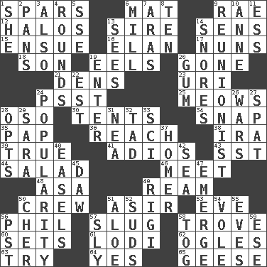 ACROSS 1. Practice fights 6. Floor covering 9. Actress Charlotte 12. Auras 13. Male parent of an animal 14. Elected reps. 15. Follow as a consequence or result 16. Style 17. Religious women 18. Male offspring 19. Snakelike fish 20. Went 21. Hiding places for outlaws 23. RI univ. 24. Inconspicuous attention getter 25. Catcalls? 28. Bear (Spanish) 30. Portable shelters 34. Fastener 35. Infant food 36. Arrive at 38. Lyricist Gershwin 39. Loyal 41. Goodbye (Sp.) 43. Fast jet (abbr.) 44. First course 46. Rendezvous 48. White ___ sheet 49. 480, 500 or 516 sheets of paper 50. Group working together 51. SW Saudi Arabia district 53. Night before a holiday 56. Silvers or Donahue 57. Strike heavily 58. Collection of objects 60. Arranges properly for use 61. Farming town in central California 62. Stares 63. Attempt 64. It is so 65. Honkers DOWN 1. A female animal or person 2. Baking dishes 3. In addition 4. Periods in a boxing match 5. Compass dir. 6. Place where flour is made 7. Ancient river in northeast Turkey 8. Nine, plus one 9. One who advocates reunion 10. Singer Murray 11. Curvy letter 13. Observes 14. Sounds asleep 19. Keyboard key 20. Chewing product 22. Eastern Standard Time (abbr.) 24. Teen's desire 26. Armed conflicts 27. Argument over a trivial matter 28. Chooses 29. "Two Mules for Sister ____" 31. Teachers' org. 32. Bit 33. _-fi 37. Home run 40. Artist's stands 42. Ocean 45. Simpleton 47. Develop 49. Swiss mountan, "Queen of the Mountains" 50. "Mermaids" star 51. _ vera 52. Beer foam 54. Short-tailed, large-bodied rat 55. Nights before holidays 56. Pacific Standard Time (abbr.) 57. Insidious 58. Coat; cloak 59. Compass dir.