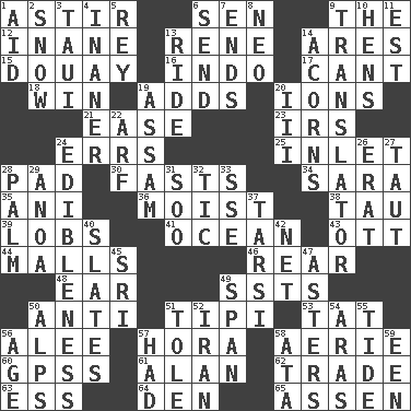 ACROSS 1. Being in motion 6. Elected rep. 9. Definite Article 12. Empty; void 13. French philosopher Descartes 14. Ancient Greek god of war 15. A city in N France, SE of Calais 16. Southeast Asian peninsula 17. Patter 18. Acquire through effort 19. Does sums 20. Charged atoms 21. Comfort 23. Big collection agency 24. Blunders 25. An arm off of a larger body of water 28. Groovy apt. 30. Goes without food and/or water 34. "Two Mules for Sister ____" 35. Cuckoo 36. Wet 38. The 19th letter of the Greek alphabet 39. Tennis shots 41. Sea 43. Baseball player Mel 44. Promenades 46. Located in or toward the back 48. Ewer handle 49. Fast planes 50. Opposed to 51. Native american tent (variation) 53. Make lace 56. Toward shelter 57. Israeli folk dance 58. Nest on high 60. Global Positioning Systems (abbr.) 61. ____ Jay Lerner 62. Barter 63. Curvy letter 64. Lair 65. NE Netherlands city DOWN 1. Assist 2. Frozen precipitation 3. "Change" in Tahitian 4. More lacking in sense or substance 5. Marina Del _, California 6. Post 7. Extremities 8. Modern: prefix 9. Interpreter 10. Coop moms 11. Eastern Standard Time (abbr.) 13. Travel on an animal 14. Oak nuts 19. Indian state 20. One more than two 22. Sandy's bark 24. The property of being fit to eat 26. Part of Q.E.F. 27. Strained 28. Inside of hand 29. Small Philippine buffalo 31. "Barney Miller" actor Jack 32. Nervous spasm 33. Compass dir. 37. Tarsus (plural) 40. Chalkboards 42. Fish or hair follower 45. _ Lanka 47. Michaelmas daisies 49. Connect, as a bridge 50. High mountains 51. Lacquered or enameled metalware 52. SW Asia republic 54. Ancient river in northeast Turkey 55. Event that recurs at intervals 56. Personal question 57. Possessed 58. "One Day ___ Time" 59. Car or cant ending