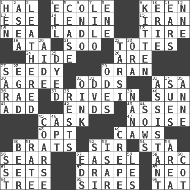 ACROSS 1. Actor Linden 4. Learning spot: Fr. 9. Peachy ____! 13. Compass dir. 14. Soviet premier 1918-24 15. SW Asia republic 16. Teachers' org. 17. Dipping utensil 18. Hoop that covers a wheel 19. _ moment's notice (2 wds.) 21. "Barney Miller" actor Jack 22. Lugs 24. Flintstone garb 26. "We ___ not amused" (Victoria) 27. Morally degraded 29. Northwest Algerian city 30. Match 31. Probability 33. White ___ sheet 36. Actress Charlotte 37. Popular '50s hangout 40. Player for Phoenix 41. Increase 42. Extremities 43. NE Netherlands city 45. Keg 47. Annoying sound 48. Choose 49. Crow sounds 50. Naughty children 52. Title for a knight 54. R.R. building 56. Wither 57. Artist's stand 59. Curve 61. Puts into a specified state 62. Window treatment 63. Modern: prefix 64. Woody plant 65. Fathers 66. Make lace DOWN 1. Layer 2. At sea 3. Resembling or made to resemble leather 4. Pipe bend 5. Desist 6. Southwest Nigerian state 7. _ and Stitch 8. Compass dir. 9. Baby cat 10. 4th largest of the Great Lakes 11. Hearing organs 12. Compass dir. 20. Assistant 22. Tarsus (plural) 23. Mouth or opening 25. Colored 27. "Two Mules for Sister ____" 28. Mild oath 29. Lyric poems 31. Pig sound 32. Movie disc 33. Helper 34. Institutes legal proceedings 35. Queen of England 1702-14 38. Musical pauses 39. Nanny 44. Sty mamas 45. Rough 46. Fitting 49. Streamer paper 50. Fermented drink made from hops 51. Pace 52. Indian skirt 53. Austrian river, tributary to the Danube 55. Length times width 56. Fast jet (abbr.) 57. Begley and Asner 58. French article 60. Small bed