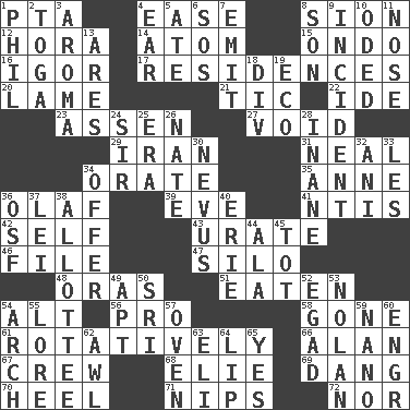 ACROSS 1. Parent Teacher Assoc. 4. Comfort 8. The Jewish people; Israel 12. Israeli folk dance 14. Tiny particle 15. Southwest Nigerian state 16. Composer Stravinsky 17. Homes 20. Unable to walk 21. Nervous spasm 22. Binary compound 23. NE Netherlands city 27. Nothingness 29. SW Asia republic 31. Be tempered by heat 34. Speak pompously 35. Queen of England 1702-14 36. Norwegian king 39. First lady 41. Nuclear Threat Initiatives 42. Automatically 43. A salt of uric acid 46. Do some clerical work 47. Grain storage tower 48. Mouths or openings 51. Eroded 54. Keyboard modifier key 56. Adept person 58. Went 61. Rotating or pertaining to rotation 66. Actor Alda or Thicke 67. Ship's personnel 68. Writer Wiesel 69. Mild oath, euphamism for damn 70. Person who is morally reprehensible 71. Pinches, bites 72. And not DOWN 1. Silvers or Donahue 2. Ancient Roman robe 3. Scent 4. Hearing organ 5. Had dinner 6. Distress signal 7. Give off 8. Boy, to dad 9. Event 10. Wrote a lyric poem 11. Sense of smell 13. Ancient Greek god of war 18. HTML Container Element 19. Environmental prefix 24. Title for a knight 25. Period 26. Nathan's nickname 28. Silly 30. Congenital growth or mark on the skin 32. Cuckoo 33. French article 34. Auction bid 36. Order of Saint Francis (abbr.) 37. Luau accessory 38. One to whom something is allotted 40. 4th largest of the Great Lakes 44. In the manner of 45. Small child 49. Fitting 50. _ Lanka 52. Mild oath 53. Pitcher Ryan 54. Bowlike part 55. Old wives' tales, e.g. 57. Baking chamber 59. Billionth: prefix 60. Engineer (abbr.) 62. Leather borer 63. Connecticut Ivy Leaguer 64. Mouth edge 65. Affirmative reply