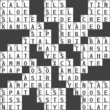 ACROSS 1. Give a ring to 5. Raised railways 8. Metal container 11. _ vera 12. Stitch closed the eyes of (a falcon) 14. Frozen water 15. Schedule 17. Event that recurs at intervals 18. Algonquian 19. Sunflower state 21. Eluded 23. Small drink 25. Confederate soldiers (slang) 26. Slanted text style (abbr.) 27. _ Lanka 28. Sound made by sheep 31. Keyboard modifier key 33. Floor protector 35. Tarsus (plural) 37. Narrow board 38. Affirmative reply 40. Cowardly lion portrayer 41. ID or VA city 43. One more than ninety 45. Had dinner 46. Infant food 47. Bear (Spanish) 50. So be it 52. SW Saudi Arabia district 53. Small boy 54. Electrical Unit 56. Gossips 61. Petty quarrel 62. Otherwise 65. Trap for birds or small mammals 66. Double-curved letter 67. Fast planes 68. Christmas carol 69. Fish or hair follower 70. Sight organ 71. Norwegian king DOWN 1. Keg 2. Silent film actress Nazimova 3. Grant temporary use of 4. Allows 5. Eastern Standard Time (abbr.) 6. Luau accessory 7. Spring feasts 8. Become fatigued 9. On the rocks 10. Born 13. Crowbar 16. 90 degrees 18. Music discs 20. Thailand, formerly 22. "This won't hurt ____!" 24. Romp 26. "Tell ____ the Marines!" 28. Naughty child 29. American tennis player Robert 30. Wind 31. _ mater 32. Desk light 34. John Ritter's dad 36. ____ Jay Lerner 37. Plant excrement 39. Scram, to a cat 42. Sense of smell 44. "If ____ say so..." 48. Male parents of animals 49. Threatening words 51. Genesis locale 52. Fitting 54. Domed church section 55. Vertical spar for supporting sails 57. Words to Nanette 58. Utensil 59. Toward the sea 60. Itself 61. Elected rep. 63. Filthy place 64. Compass dir.