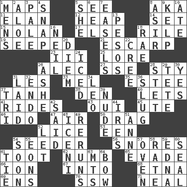 ACROSS 1. Atlas contents 5. Observe 8. Alias (abbr.) 11. Flair 12. Pile 14. Put into a specified state 15. Pitcher Ryan 17. Otherwise 18. Cause heat under the collar 19. Oozed 21. Fortification 23. One more than two 25. Old wives' tales, e.g. 26. Actor Baldwin 27. Compass dir. 28. Filthy place 31. French article 33. Cartoonist voice _ Blanc 35. First name in cosmetics 37. Hyperbolic tangent 38. Lair 40. Allows 41. Amusement-park features 43. Fr. "Yes" 45. Shoshoni 46. Wedding promise 47. Wind 50. To trail on the ground 52. Louse (plural) 53. Car or cant ending 54. Sowing specialist 56. Sounds asleep 61. A blast of a horn 62. Unfeeling 65. Elude 66. Electrically charged atom 67. To the inside or interior of 68. Inactive volcano in Sicily 69. Followers of ems 70. Compass dir. 71. Anneal DOWN 1. Not women's 2. _ vera 3. Diluted with white 4. Fastener 5. A female animal or person 6. Snakelike fish 7. Artist's stands 8. SW Saudi Arabia district 9. Seaweed 10. Had dinner 13. Mexican monetary units 16. Famous astronaut Armstrong 18. Actress Charlotte 20. South Vietnam president (1954) 22. Algonquian 24. On the rocks 26. American tennis player Robert 28. Proofreading order 29. Wig 30. Affirmative reply 31. Put down 32. Inside; within (prefix) 34. Lion 36. A hard, heavy blow 37. Three (prefix) 39. Naked 42. Stated 44. Angers 48. Ancient Celtic tribe of eastern Britain 49. Summer TV shows 51. Singer Murray 52. Allow 54. Within a short period 55. Immeasurably long periods of time 57. Baking chamber 58. Assign a rank or rating to 59. Pulitzer Prize-winning author Ferber 60. Lick closed 61. Make a knot 63. Mountains (abbr.) 64. Ribbon knot