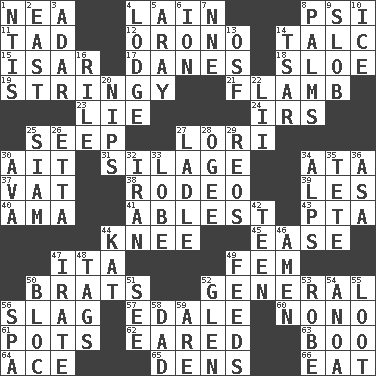 ACROSS 1. Teachers' org. 4. (Had) reclined 8. 23rd letter of the Greek alphabet 11. Small boy 12. U. of Maine site 14. Baby powder 15. Austrian river, tributary to the Danube 17. Natives or inhabitants of Denmark 18. _ gin 19. Slender, wiry 21. Flambe (short form) 23. Untruth 24. Big collection agency 25. Ooze 27. Australian parrot (variant) 30. Small island 31. Fodder prepared in a silo 34. _ moment's notice (2 wds.) 37. Large container 38. Cowboy competition 39. French article 40. Nanny (var.) 41. Most capable 43. Parent Teacher Association (abbr.) 44. Leg joint 45. Relaxation 47. Call ___ day 49. Opposite of masc. 50. Naughty children 52. Commissioned military rank 56. Volcanic refuse 57. Peak District village in England 60. Words to Nanette 61. Cooking vessels 62. Having ears or earlike features 63. Surprise greeting 64. Adept person 65. Habitations of wild animals 66. Consume DOWN 1. Nuclear Threat Initiatives 2. Compass direction 3. The sixth month of the Jewish calendar 4. Cabin 5. Like ___ of sunshine 6. Electrically charged atom 7. Compass dir. 8. Insides of hands 9. Oscar Madison type 10. Frozen water 13. Order of Saint Francis (abbr.) 14. Russian ruler of old 16. Cause heat under the collar 20. Cuts off 22. Cards in a Roman deck? 25. Thailand, formerly 26. Singer James 27. Dipping utensil 28. Double curve, resembling the letter S 29. Vintage cars 30. Actress Gardner 32. SW Asia republic 33. Ear part 34. High mountains 35. False hair 36. White ___ sheet 42. Adolescent 44. Krazy ___ of comics 46. So be it 47. Feeling or showing extreme anger 48. Labels 49. Gives food to 50. Group of countries in special alliance 51. Perceive with the eye 52. Small, secluded valley 53. Loose flowing garment 54. Small Philippine buffalo 55. Spoils 56. Health resort 58. June honoree 59. "We ___ not amused" (Victoria)