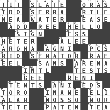ACROSS 1. Teat (slang) 4. Schedule 9. Mouths or openings 13. Wedding promise 14. Father Junipero _ 15. Cause heat under the collar 16. Teachers' org. 17. Wetness 18. Comfort 19. Increase 21. To separate or throw off 22. Phone greeting 24. Public display of a written message 26. Curvy letter 27. Distance measurement 29. Toward shelter 30. Odor 31. Hindu god of fire 33. Personal Computers (abbr.) 36. River (Sp.) 37. Legislator 40. Actress Charlotte 41. Snakelike fish 42. Without 43. Sports stadium 45. International (abbr.) 47. Trials 48. Turn to the right 49. Painter Guido (1575-1642) 50. Portable shelters 52. Black tropical American cuckoo 54. Begley and Asner 56. "Corrida" creature 57. Lacking in sense or substance 59. Biblical high priest 61. Having or resembling wings 62. With motion or animation 63. Or not 64. False hair 65. Eucharist need 66. Afternoon social gathering DOWN 1. Metal container 2. The main thing one is thinking about 3. Inedible or poisonous agaric 4. Compass dir. 5. Acquire or gain knowledge or skills 6. Johnson of "Laugh-In" 7. Woody plant 8. Ewer handle 9. Threatening words 10. Monetary unit of Yemen 11. In addition 12. Observe 20. South Vietnam president (1954) 22. Sun: prefix 23. Compass dir. 25. Pate de foie ____ 27. Female horse 28. 4th largest of the Great Lakes 29. Pismires 31. Of or related to the anus 32. Separate the seeds from cotton 33. Elected leader of a country 34. Patter 35. Oceans 38. _____ Park, CO 39. Pace 44. French philosopher Descartes 45. Disregard 46. Fish or hair follower 49. Remove soap 50. Lacquered or enameled metalware 51. Part of Q.E.F. 52. Small Philippine buffalo 53. Political cartoonist Thomas 55. _ gin 56. Make lace 57. Naughty child 58. Period of immesurable duration 60. Lyricist Gershwin