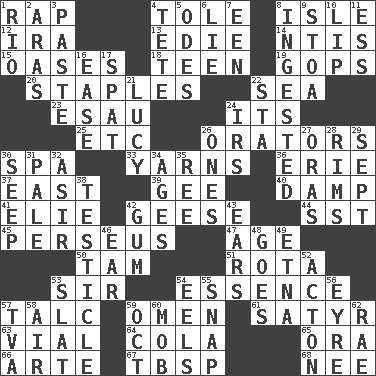 ACROSS 1. Reproach for some lapse or misdeed 4. Lacquered or enameled metalware 8. Small island 12. Retirement account (abbr.) 13. Singer Brickell 14. Nuclear Threat Initiatives 15. Fertile tracts in a desert 18. Adolescent 19. Republicans 20. Paper fasteners 22. Ocean 23. Son of Isaac 24. It is 25. And so on (abbr.) 26. Speakers 30. Health resort 33. Tall tales 36. One of the Great Lakes 37. Compass direction 39. Unit of force equal to gravity 40. Moist 41. Writer Wiesel 42. Honkers 44. Fast jet (abbr.) 45. Son of Zeus who helped slay Medusa 47. Grow older 50. Scottish cap 51. Roll call or roster of names 53. Title for a knight 54. Center 57. Baby powder 59. Presage 61. Letch 63. Small bottle 64. Root beer relative 65. Mouth or opening 66. Johnson of "Laugh-In" 67. Cook's measure (abbr.) 68. Born DOWN 1. River (Sp.) 2. Caspian sea tributary 3. Thick mixture 4. Wig 5. Lyric poems 6. Whopper 7. Car or cant ending 8. Eaten 9. Portico 10. Mouth edge 11. Double-curved letter 16. Comfort 17. Petty quarrel 21. "I Love _" 22. R.R. building 24. Big collection agency 26. Singles 27. Mouths or openings 28. Basketball hoops 29. Back-to-school mo. 30. Ooze 31. Diluted with white 32. SW Saudi Arabia district 34. Eras 35. To separate or throw off 38. A testis 42. Chewing product 43. Hearing organs 46. Ewer handle 48. Leaves 49. Inactive volcano in Sicily 52. 13-14th century defensive garment 53. Narrow board 54. Snakelike fish 55. Fastener 56. Jane of fiction 57. Federal power corp. 58. Wind 59. Sep. follower 60. Disorderly crowd 62. Actress Charlotte