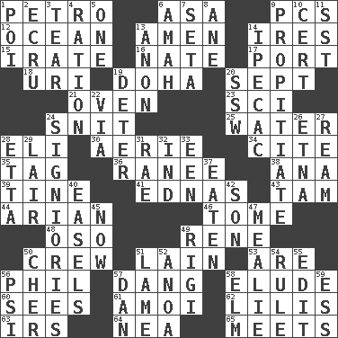 ACROSS 1. Stone: prefix 6. White ___ sheet 9. Personal Computers (abbr.) 12. Sea 13. So be it 14. Angers 15. Feeling or showing extreme anger 16. Nathan's nickname 17. Left side of a ship or aircraft 18. RI univ. 19. Capital of the state of Qatar 20. Back-to-school mo. 21. Baking chamber 23. _-fi 24. In a ____ (agitated or irritated) 25. Wetness 28. Connecticut Ivy Leaguer 30. Nest on high 34. Quote 35. Label 36. Indian princess (variant) 38. Santa ___, CA 39. Prong on a fork 41. Ferber et al. 43. Scottish cap 44. Believer in; advocate of (suffix) 46. Heavy book 48. Bear (Spanish) 49. French philosopher Descartes 50. Ship's personnel 51. (Had) reclined 53. "We ___ not amused" (Victoria) 56. Silvers or Donahue 57. Mild oath, euphamism for damn 58. Dodge 60. Perceives with the eye 61. Mine, in Marseilles 62. Ms. Damita and namesakes 63. Big collection agency 64. Teachers' org. 65. Confronts DOWN 1. Luau course 2. Shade of tan 3. Rend 4. Food allowance for one day 5. Single 6. Wet nurse 7. Bristle 8. One (Scot) 9. Appease 10. Foregone conclusion 11. Fast jet (abbr.) 13. Soon (poet.) 14. Medicinal drug used to evoke vomiting 19. Prevent from occurring 20. Compass dir. 22. By way of 24. Seigniories (variant) 26. Inactive volcano in Sicily 27. 480, 500 or 516 sheets of paper 28. Singer James 29. Den 31. Actress Charlotte 32. Indiana (abbr.) 33. Car or cant ending 37. Eroded 40. Artist's stands 42. Male offspring 45. At this time 47. Ear of corn 49. Swiss mountan, "Queen of the Mountains" 50. "Mermaids" star 51. Unable to walk 52. Small Philippine buffalo 54. General guideline 55. Prepare for publication 56. Air pressure measure (abbr.) 57. Daniel's nick name 58. Shade tree 59. Curvy letter