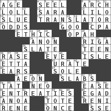 ACROSS 1. Ripen 4. Stitch closed the eyes of (a falcon) 8. Bowlike part 12. Hang loosely or laxly 14. "Two Mules for Sister ____" 15. _ and Stitch 16. Turn sharply 17. Interpreter 20. Likelihood 21. Thick or sticky substance 22. Accounting whiz (abbr.) 23. Value system 27. Brightly colored fish 29. Soon (poet.) 31. Capital of Latvia 34. Chalkboard 35. Adolescent 36. To erase 39. First lady 41. Capri or Wight 42. Singer James 43. A salt of uric acid 46. Hearing organs 47. Flatfish 48. A really long time 51. Broad, flat, thick pieces 54. Make lace 56. Modern: prefix 58. Comfort 61. Pleas 66. Mild oath 67. Small Philippine buffalo 68. Lug 69. Painter Guido (1575-1642) 70. French philosopher Descartes 71. At one time in the past 72. Compass dir. DOWN 1. In addition 2. Aureate 3. Dodge 4. Fast jet (abbr.) 5. Ewer handle 6. Epoch 7. Long (Scottish) 8. Insect wing 9. Actors Guy, Robert Welles, and Clint 10. Hoof sound 11. Israeli folk dance 13. For fear that 18. "Barney Miller" actor Jack 19. Chop off 24. Actor Linden 25. _ tizzy (2 wds.) 26. ____ d'Azur (French Riviera) 28. Nick name for Arthur 30. Mole, birthmark 32. Set 33. One (Scot) 34. Gospel singer Marvin 36. Portuguese money of account (variant) 37. "One Day ___ Time" 38. Ski resort town in Vermont 40. Greek god of love 44. Everything 45. Beverage made from leaves 49. Single 50. Teachers' org. 52. Fermented drink made from hops 53. Gurus 54. Pull into pieces 55. Queen of England 1702-14 57. "Beetle Bailey" pooch 59. Without 60. Singer Brickell 62. Actress Charlotte 63. Electrically charged atom 64. And so on (abbr.) 65. Perceive with the eye