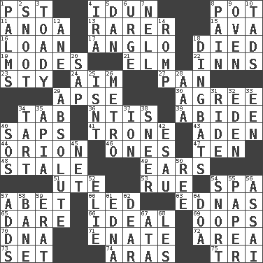 ACROSS 1. Pacific Standard Time (abbr.) 4. Goddess of spring and wife of Bragi 8. Plant holder 11. Small Philippine buffalo 13. More uncommon 15. Actress Gardner 16. Grant temporary use of 17. White American of non-Hispanic descent 18. Passed on 19. Methods 21. Shade tree 22. Taverns 23. Filthy place 24. Direct toward a target or goal 27. Baking dish 29. Domed church section 30. Match 34. Keyboard key 36. Nuclear Threat Initiatives 39. Remain 40. Plant excrements 41. Marketplace scale 43. Arabian gulf 44. Constellation of myth 46. Washington bills 47. Nine, plus one 48. Lacking originality or spontaneity 49. Hearing organs 51. Shoshoni 53. Regret 54. Health resort 57. Collude with 60. Directed 63. Ferber et al. 65. Have the gumption 66. Standard of perfection 69. I made a mistake 70. Heredity factor (abbr.) 71. Related on the mother's side 72. Type of rug 73. Arrange properly for use 74. Ancient river in northeast Turkey 75. Three (prefix) DOWN 1. Insides of hands 2. Snout, nose 3. Sycophant 4. Retirement account (abbr.) 5. Daniel's nick name 6. Goad 7. 1994 drama film starring Jodie Foster 8. Ache 9. Baking chamber 10. Bits 12. A saturated hydrocarbon 14. Frolic 18. Empty-headed or silly people 20. Plant excrement 25. Is not 26. Paris' subway 28. Auto club (abbr.) 29. Utter; complete 31. Travel on an animal 32. Genesis locale 33. Car or cant ending 34. Small pie 35. Capital of Western Samoa 37. Electrically charged atom 38. Scornful expression 40. Mayday 42. Son of Isaac 45. Fish or hair follower 50. Portuguese money of account (variant) 52. Writer Wiesel 54. Derisive sound 55. Some stationery 56. Slender Brazilian palm 57. Sums up 58. Object of repulsion 59. Part of Q.E.F. 61. Pulitzer Prize-winning author Ferber 62. Letter starter 64. ___ good deed 67. _ moment's notice (2 wds.) 68. French article