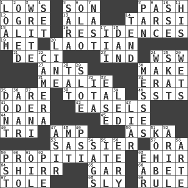 ACROSS 1. Coldest temperatures 5. Boy, to dad 8. Romantic infatuation 12. Legendary monster 13. Chicken ___ king 14. Tarsus (plural) 15. Came down and settled, as after flight 16. Homes 19. Was introduced to 20. Of or relating to Laos or its people 21. Tenth: prefix 23. Working for oneself (abbr.) 24. Compass dir. 27. Pismires 30. Create 31. Ear of corn 34. Part of Q.E.F. 35. Have the gumption 38. Add up to 40. Fast planes 41. Baltic tributary 42. Artist's stands 44. Grandmother 45. Singer Brickell 46. Three (prefix) 47. Electrical Unit 50. "____ silly question..." 53. More disrespectful 57. Mouth or opening 59. Appease 63. Independent ruler or chieftain 64. Bake eggs in their shells 65. Slender fish 66. Collude with 67. Lacquered or enameled metalware 68. Mischievous 69. Court order DOWN 1. Rich soil 2. Stared at amorously 3. Compose 4. Arrange properly for use 5. "Two Mules for Sister ____" 6. Butter sub 7. Political cartoonist Thomas 8. Baking dish 9. Curve 10. Compass dir. 11. Part of HMS, perhaps 14. Be inclined (to) 17. One more than two 18. Daniel's nick name 20. Actor's bit 22. Device for capturing images 24. Armed conflicts 25. Three-handed card game 26. Moistens 28. Make lace 29. _ gin 30. Makes clutter 32. Call ___ day 33. Relaxation 35. Do not 36. The sixth month of the Jewish calendar 37. Painter Guido (1575-1642) 39. Directed 43. One who doesn't tell the truth 47. SW Saudi Arabia district 48. Floor protector 49. 23rd letter of the Greek alphabet 51. Dried seaweed eaten as food 52. Satellite of Uranus 54. Settles 55. Slanted text style (abbr.) 56. Suggestive of the supernatural 58. Johnson of "Laugh-In" 59. Pacific Standard Time (abbr.) 60. 17th letter of the Greek alphabet 61. Lubricate 62. Before (prefix) 63. Ewer handle