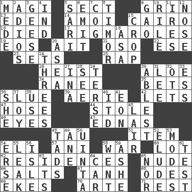 ACROSS 1. Wise men 5. Religious group 9. Amused look 13. Paradise 14. Mine, in Marseilles 15. Capital of Egypt 16. Passed on 17. Frustrating wastes of time 19. Greek goddess of the dawn 20. Small island 21. Bear (Spanish) 22. Compass dir. 23. Arranges properly for use 25. Reproach for some lapse or misdeed 26. Robbery 30. Medicinal plant 34. The wife of a rajah (variant) 35. Wagers 36. Change direction abruptly 39. Nest on high 42. Allows 43. Flexible conduit 44. Fur scarf 46. Sight organs 47. Ferber et al. 48. The 19th letter of the Greek alphabet 51. A distinct part 54. Biblical high priest 57. Cuckoo 58. Armed conflict 60. Car dealer's back yard 62. Homes 65. Naked 66. Table seasonings 67. Hyperbolic tangent 68. Lyric poems 69. Supplements with great effort 70. Johnson of "Laugh-In" 71. Take ten DOWN 1. Ancient Persian 2. Goodbye (Sp.) 3. Honkers 4. Indiana (abbr.) 5. Indian skirt 6. Give off 7. Gear tooth 8. The easternmost of the Lesser Sundas 9. E Mali city 10. Cause heat under the collar 11. Angers 12. Olfactory organ 15. Riding implement 18. White ___ sheet 20. At sea 24. Threesomes 27. _ tizzy (2 wds.) 28. Observe 29. Laconic 30. Most capable 31. Area sheltered from the wind 32. Baseball player Mel 33. Double-curved letter 36. A female animal or person 37. Myrna of the movies 38. Purpose 40. It would 41. Period of immesurable duration 45. Den 48. Small boys 49. One (Scot) 50. National forest in Provo, Utah 52. Evade 53. Methods 54. Celtic language 55. Path through which fluid escapes 56. Capri or Wight 58. Gone 59. American tennis player Robert 61. Trial 63. It is 64. 4-wheeled motor vehicle 65. Not either