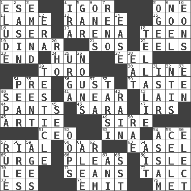 ACROSS 1. Compass dir. 4. Russian composer Stravinsky 8. Single 11. Unable to walk 13. Indian princess (variant) 15. Thick or sticky substance 16. One who uses or employs something 17. Sports stadium 18. Adolescent 19. Middle Eastern gold or silver currency 21. Distress signal 22. Snakelike fish 23. Conclude 24. Attila the _ 27. Snakelike fish 29. "Corrida" creature 30. Place in a line 34. Before (prefix) 36. Abrupt rush of wind 39. Clothes sense 40. Perceives with the eye 41. Approach 43. (Had) reclined 44. Leg coverings 46. "Two Mules for Sister ____" 47. Big collection agency 48. Nick name for Arthur 49. Male parent of an animal 51. Corporate head (abbr.) 53. _ tizzy (2 wds.) 54. Adept person 57. Monetary unit of Yemen 60. Boat paddle 63. Artist's stand 65. Goad 66. Entreaties 69. Small island 70. Area sheltered from the wind 71. Actors Connery and Penn 72. Baby powder 73. Double-curved letter 74. Send forth 75. Was introduced to DOWN 1. Dodge 2. Indian antelope 3. Make improvements or corrections to 4. Lyricist Gershwin 5. Slender fish 6. Singles 7. Former U.S. Attorney General Janet 8. Double curve, resembling the letter S 9. Christmas carol 10. Immeasurably long periods of time 12. Period 14. Comfort 18. Copy Pinocchio 20. 17th letter of the Greek alphabet 25. Capital and largest city of Mongolia 26. Parts of speech 28. Ingest 29. A testis 31. Austrian river, tributary to the Danube 32. Nuclear Threat Initiatives 33. Car or cant ending 34. Lightbulb-shaped fruit 35. Monthly bill 37. Ocean 38. Tarsus (plural) 40. Health resort 42. Water falling in drops from the sky 45. Observe 50. Actress Charlotte 52. I made a mistake 54. Indian state 55. Cell (Danish) 56. Choose 57. Court order 58. Angers 59. Grows older 61. Toward shelter 62. 480, 500 or 516 sheets of paper 64. Small island 67. Black tropical American cuckoo 68. Fast jet (abbr.)