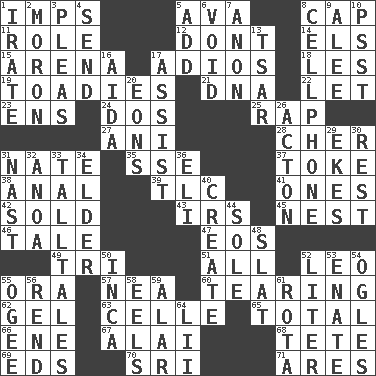 ACROSS 1. Naughty children 5. Actress Gardner 8. Head covering 11. Hero or heavy, e.g. 12. Do not 14. Raised railways 15. Sports stadium 17. Goodbye (Sp.) 18. French article 19. Sycophants 21. Heredity factor (abbr.) 22. Allow 23. Followers of ems 24. Two (Sp.) 25. Hit sharply and swiftly 27. Cuckoo 28. "Mermaids" star 31. Nathan's nickname 35. Compass dir. 37. Casino tip 38. Of or related to the anus 39. Affectionate concern, for short 41. Washington bills 42. Exchanged or delivered for money 43. Big collection agency 45. A home for chicks 46. Story 47. Greek goddess of the dawn 49. Three (prefix) 51. 100% 52. Lion 55. Mouth or opening 57. Teachers' org. 60. Pulling into pieces 62. Set 63. Cell (Danish) 65. Add up to 66. Compass dir. 67. Mountain range southwest of Kyrgyzstan 68. Wig 69. Begley and Asner 70. Indian title of respect (Mr.) 71. Ancient Greek god of war DOWN 1. Feeling or showing extreme anger 2. Person of subnormal intelligence 3. Entreaties 4. Post 5. Find the sum of 6. Empty area or space 7. At once, immediately (arch.) 8. Portable communications device 9. Toward shelter 10. Inconspicuous attention getter 13. Russian ruler of old 16. Opera by Verdi 17. Help 20. Immeasurably long periods of time 26. Gambison 29. Makes supply last 30. Remainder 31. Political cartoonist Thomas 32. Small Philippine buffalo 33. Baron Munchausen's specialties 34. A person who is older than you are 36. Connecticut Ivy Leaguer 40. Make 44. Not divided or shared with others 48. Narrow board 50. South American Indian 52. 61 cubic inches 53. Related on the mother's side 54. Stares at amorously 55. Double curve, resembling the letter S 56. Tear apart 58. Snakelike fish 59. Having or resembling wings 61. Roll call or roster of names 64. Cards in a Roman deck?