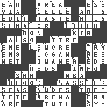 ACROSS 1. Hearing organ 4. Length times width 8. Compass dir. 11. By way of 12. Cell (Danish) 14. Pismires 15. Prepare for publication 17. Clothes sense 18. Nuclear Threat Initiatives 19. Legislator 21. 61 cubic inches 23. Spanish title 24. Apertif with cassis 25. In addition 27. Become fatigued 30. Compass dir. 31. Poe poem 34. Attempt to accomplish something 37. Followers of ems 38. Utah city north of Ogden 39. Portuguese money of account (variant) 40. Fish or hair follower 41. Sillier 43. Begley and Asner 44. Vintage cars 45. A message received and understood 47. Quiet! 49. Basketball assoc. 50. Vital fluid 52. More impudent 56. Oceans 57. Unclothed pictures 60. Relationship diagram 61. False hair 62. Sports stadium 63. Period 64. "We ___ not amused" (Victoria) 65. International (abbr.) 66. Symbol (abbr.) DOWN 1. Nights before holidays 2. Assistant 3. Water falling in drops from the sky 4. 13-14th century defensive garment 5. Bring up, as a child 6. Raised railways 7. Keyboard modifier key 8. Keyboard key 9. Commotion 10. Double-curved letter 13. Snakelike fish 14. Against 16. Small amounts or degrees 20. Utensil 22. Mamie's mate 25. Singer Murray 26. For fear that 27. Ancient Roman robes 28. SW Asia republic 29. French philosopher Descartes 30. Car or cant ending 32. Writer Wiesel 33. Words to Nanette 34. Unclean, religiously 35. Make new 36. Consenting reply 42. Teases 44. 17th letter of the Greek alphabet 46. Political cartoonist Thomas 47. Chalkboard 48. Flexible conduit 49. Relating to the nose 50. Fermented drink made from hops 51. Heredity factor (abbr.) 52. Emitted 53. Angers 54. Suggestive of the supernatural 55. 480, 500 or 516 sheets of paper 56. R.R. building 58. RI univ. 59. Lair