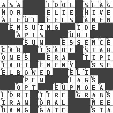 ACROSS 1. White ___ sheet 4. Utensil 8. Volcanic refuse 12. Not either 13. Writer Wiesel 14. Hub of activity 15. Native American of Southwest Alaska 18. Snakelike fish 19. So be it 20. Taking place subsequently 22. Binary compound 23. Tenement units (abbr.) 24. RI univ. 25. Player for Phoenix 26. Gist 30. Automobile 33. Sadhe (variant) 36. Play the lead 37. Washington bills 39. Epoch 40. Native american tent (variation) 41. Drawn tight 42. Foe 44. Compass dir. 45. Shoved, as through a crowd 47. Connecticut Ivy Leaguer 50. Fenced enclosure 51. Fails to keep up a pace 53. Elect 54. Normal relaxed breathing 57. Australian parrot (variant) 59. Become fatigued 61. Catches 63. SW Asia republic 64. Spoken 65. Born 66. Mild oath, euphamism for damn 67. Yard entry 68. R.R. building DOWN 1. Santa ___, CA 2. Not divided or shared with others 3. Sports stadium 4. Adolescent 5. Cassini of fashion 6. Lubricate 7. French article 8. Most dark, concealed or hidden 9. Welles in "The Third Man" 10. "___ Maria" 11. Commissioned mil. rank 16. United States Postal Service (abbr.) 17. Ballerina skirt 21. Is not 22. Big collection agency 24. Purpose 26. Dutch treat 27. Nuclear Threat Initiatives 28. Smile enhancers 29. One of the Great Lakes 30. ____ d'Azur (French Riviera) 31. Of or related to the anus 32. Reuben's nickname 34. Post 35. "We ___ not amused" (Victoria) 38. Ceasing 42. Car or cant ending 43. Sharp bark 46. Dripping 48. Austrian-born American filmmaker Fritz 49. Russian composer Stravinsky 52. Seines 53. NW Algerian seaport 54. Part of Q.E.F. 55. Ubangi River tributary 56. Collude with 57. Flaplike covering 58. Mouth or opening 59. Coat; cloak 60. Lyricist Gershwin 62. Ocean