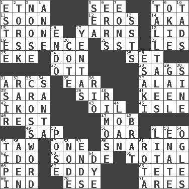 ACROSS 1. Inactive volcano in Sicily 5. Observe 8. Small child 11. Within a short period 12. Greek god of love 14. Alias (abbr.) 15. Marketplace scale 17. Entertaining tales 18. Flaplike covering 19. Center 21. Fast jet (abbr.) 22. French article 23. Supplement with great effort 24. Spanish title 25. Put into a specified state 27. Baseball player Mel 28. Sinks 31. Curves 35. Hearing organ 37. Jai ____ 38. "Two Mules for Sister ____" 39. Title for a knight 41. Peachy ____! 42. Picture 43. Lubricate 45. Small island 46. Remainder 47. Crowd into 49. Plant excrement 51. Rowing implement 52. Lion 55. The 23rd letter of the Hebrew alphabet 57. Single 60. Catching in a trap 62. Wedding promise 63. Something which is sent 65. "_____ Recall" 66. For each 67. Whirlpool 68. False hair 69. Indiana (abbr.) 70. Compass dir. 71. Ancient Greek god of war DOWN 1. First name in cosmetics 2. Cod relative 3. Trap for birds or small mammals 4. Queen of England 1702-14 5. Ocean 6. Blunders 7. Immeasurably long periods of time 8. Baron Munchausen's specialties 9. Migrant worker of the '30s 10. Small boys 13. Fast planes 16. Inside; within (prefix) 17. Gossips 20. ____ d'Azur (French Riviera) 26. 1973 Nobel Price Winner (Physics) Leo 29. Highlander 30. Trig term 31. SW Saudi Arabia district 32. Immoral or dissolute person 33. What you're doing now 34. Before Barbara or Clara 36. _ de Janeiro 40. Full of chinks, cracks, or crevices 44. Grant temporary use of 48. Naughty child 50. Introduce or present, as a question 52. 61 cubic inches 53. Related on the mother's side 54. Stares at amorously 55. Native american tent (variation) 56. An important port of Yemen 58. Connecting point 59. Conclusions 61. Round or rotation of duties 64. Color