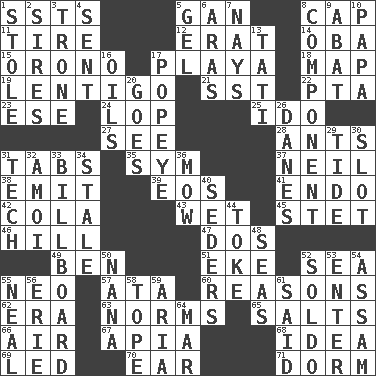 ACROSS 1. Fast planes 5. Separate the seeds from cotton 8. Head covering 11. Become fatigued 12. Part of Q.E.F. 14. Chief or king in Benin or Nigeria 15. U. of Maine site 17. Beach, in Buenos Aires 18. Atlas unit 19. Small, flat, pigmented spot on the skin 21. Fast jet (abbr.) 22. Parent Teacher Association (abbr.) 23. Compass dir. 24. Chop off 25. Wedding promise 27. Observe 28. Pismires 31. Bar bills 35. Symbol (abbr.) 37. Famous astronaut Armstrong 38. Send forth 39. Greek goddess of the dawn 41. Inside; within (prefix) 42. Root beer relative 43. Dripping 45. Proofreading order 46. Land elevation 47. Two (Sp.) 49. Benjamin's nick name 51. Supplement with great effort 52. Ocean 55. Modern: prefix 57. _ moment's notice (2 wds.) 60. Thinks logically 62. Period 63. Typical models 65. Table seasonings 66. Wind 67. Capital of Western Samoa 68. The content of cognition 69. Directed 70. Ewer handle 71. Dormintory (informal) DOWN 1. Took without asking 2. Founders of families 3. Heavy duty weighing machine 4. Posted 5. Set 6. Ancient river in northeast Turkey 7. Negative votes 8. Piece 9. Blind as ____ 10. Dad 13. Jacques of French films 16. Lubricates 17. Wimpy's pal 20. Travels 26. Natives or inhabitants of Denmark 29. Event that recurs at intervals 30. Position in a hierarchy or organization 31. Technical work 32. Mine, in Marseilles 33. Big road sign 34. Having lost freshness 36. Cut the grass 40. Spring feasts 44. Casino tip 48. Oceans 50. Grandmother 52. Twentieth part of a lira 53. Keyboard key 54. Indian state 55. Actress Patricia 56. 4th largest of the Great Lakes 58. Drink excessively 59. Operatic vocal solo 61. Stated 64. Make imperfect