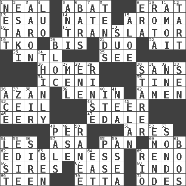 ACROSS 1. Anneal 5. Blind as ____ 9. Part of Q.E.F. 13. Son of Isaac 14. Nathan's nickname 15. Scent 16. Edible starchy tuberous root 17. Interpreter 19. Ring climax 20. Again 21. Superhero pair 22. Small island 23. International (abbr.) 25. Perceive with the eye 26. Home run 30. Without 34. Ancient Celtic tribe of eastern Britain 35. Prong on a fork 36. Muslim summons to prayer 39. Soviet premier 1918-24 42. So be it 43. To provide with a ceiling 44. Guide 46. Suggestive of the supernatural 47. Peak District village in England 48. For each 51. Ancient Greek god of war 54. French article 57. White ___ sheet 58. Baking dish 60. Disorderly crowd 62. The property of being fit to eat 65. Western Nevada city 66. Fathers 67. Comfort 68. _ china 69. Adolescent 70. Singer James 71. Lyric poems DOWN 1. Remaining after all deductions 2. 1973 Nobel Price Winner (Physics) Leo 3. Composer Copland 4. Nilotic language 5. Opposed to 6. Taverns 7. "One Day ___ Time" 8. Looks after 9. Period 10. Round or rotation of duties 11. Mine, in Marseilles 12. Small pie 15. _ vera 18. Institute legal proceedings 20. Group of countries in special alliance 24. Without thickness 27. Cartoonist voice _ Blanc 28. Compass dir. 29. Wash lightly 30. A viewer who gazes fixedly 31. Direct toward a target or goal 32. Compass dir. 33. Elected rep. 36. Adept person 37. Last letter of the English alphabet 38. Atmosphere 40. It would 41. Teachers' org. 45. Liveliness 48. Friends 49. Compass dir. 50. The wife of a rajah (variant) 52. Make improvements or corrections to 53. Something which is sent 54. For fear that 55. Singer Brickell 56. Beget 58. Inconspicuous attention getter 59. Toward the sea 61. Scornful sounds 63. Benjamin's nick name 64. Consume 65. _ de Janeiro