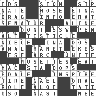 ACROSS 1. Begley and Asner 4. The Jewish people; Israel 8. Small drink 11. Nathan's nickname 13. Stockings 14. Inactive volcano in Sicily 15. To trail on the ground 16. A message received and understood 17. Part of Q.E.F. 18. Legislator 21. Place in a line 22. Do not 23. Compass dir. 25. Fenced enclosure 26. Keyboard modifier key 29. A testis 32. Sibling's daughter 34. _ tizzy (2 wds.) 35. Two (Sp.) 38. Of or related to the anus 39. French painter Edouard 41. Makes supply last 43. Compass dir. 44. Curve 45. Join together 46. French bagpipes 50. Ingest 51. Big _ 54. R.R. building 55. I made a mistake 57. Peak District village in England 59. Stimulate to action 63. Become fatigued 64. Highlander 67. Of the mouth 68. Hero or heavy, e.g. 69. _ vera 70. Jacques of French films 71. Bear (Spanish) 72. Political cartoonist Thomas 73. Born DOWN 1. Conclusions 2. Have the gumption 3. Comedian Laurel of Laurel & Hardy 4. Chest coverings 5. Electrically charged atom 6. Order of Saint Francis (abbr.) 7. Modern: prefix 8. Long narrow piece of something 9. Empty; void 10. Eucharist need 12. Mild oath 14. Snakelike fish 19. Haul 20. Single 21. Leather borer 23. Trig term 24. Leave at once 26. Santa ___, CA 27. Actor's bit 28. Beverages made from leaves 30. Colored lightly or faintly 31. Locale of original sin 33. To starve (Brit.) 36. Migrant worker of the '30s 37. Stalk of a moss capsule 39. Vertical spar for supporting sails 40. Type of rug 42. Put into a specified state 45. United States Postal Service (abbr.) 47. Purpose 48. Bathroom 49. A really long time 51. Paris' subway 52. Goodbye (Sp.) 53. Monte _, Las Vegas Hotel/Casino 56. Blemish 58. Area sheltered from the wind 60. SW Asia republic 61. Assign a rank or rating to 62. Writer Wiesel 64. Separate the seeds from cotton 65. Chicken ___ king 66. Greek goddess of the dawn