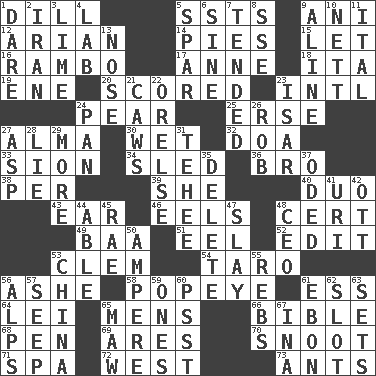 ACROSS 1. Deli pickle 5. Fast planes 9. Black tropical American cuckoo 12. Believer in; advocate of (suffix) 14. Sliced desserts 15. Allow 16. Role for Stallone 17. Singer Murray 18. Call ___ day 19. Compass dir. 20. Tallied 23. International (abbr.) 24. Lightbulb-shaped fruit 25. Celtic language 27. _ mater 30. Soggy 32. ___ good deed 33. The Jewish people; Israel 34. Downhill vehicle 36. Sis' sibling 38. For each 39. A female animal or person 40. Superhero pair 43. Hearing organ 46. Snakelike fish 48. An absolute certainty 49. Sound made by sheep 51. Snakelike fish 52. Prepare for publication 53. Clement's nick name 54. Edible starchy tuberous root 56. American tennis player Robert 58. Wimpy's pal 61. Double-curved letter 64. Luau accessory 65. Not women's 66. The Good Book 68. Writing instrument 69. Ancient Greek god of war 70. Snob 71. Health resort 72. 270 degrees 73. Pismires DOWN 1. Have the gumption 2. SW Asia republic 3. Welles in "The Third Man" 4. Experiment locale 5. Practice fight 6. Trig term 7. Watched over 8. Compass dir. 9. Place in a line 10. Remaining after all deductions 11. Slanted text style (abbr.) 13. Characteristic smell of wine 21. Crow sounds 22. Threatening words 23. Austrian river, tributary to the Danube 24. Baking dish 26. Director Reiner 27. Cleo's killer 28. Untruth 29. Greater amount 31. Giggle 35. Keyboard key 37. Wrote a lyric poem 41. RI univ. 42. Baseball player Mel 44. Competent 45. Actress Charlotte 47. Kill 48. Corporate head (abbr.) 50. Electrical Unit 53. Large country 55. Confederate soldiers (slang) 56. High mountains 57. Ooze 59. Washington bills 60. Inconspicuous attention getter 61. Inky black, to poets 62. Slit 63. Arranges properly for use 65. Informal term for the mouth 67. _ tizzy (2 wds.)