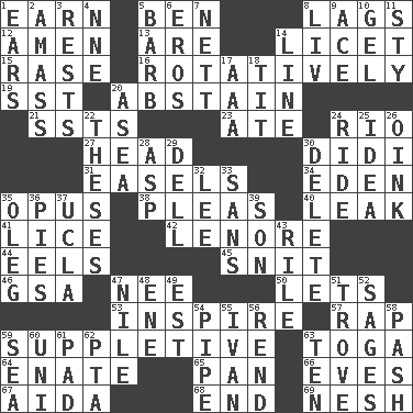 ACROSS 1. Merit 5. Benjamin's nick name 8. Falls behind 12. So be it 13. "We ___ not amused" (Victoria) 14. It is permitted: Lat. 15. To erase 16. Producing rotation 19. Fast jet (abbr.) 20. Refrain by choice 21. Fast planes 23. Had dinner 24. _ de Janeiro 27. Froth on beer 30. "You Light Up My Life" star Conn 31. Artist's stands 34. Paradise 35. Musical composition 38. Entreaties 40. Path through which fluid escapes 41. Louse (plural) 42. Poe poem 44. Snakelike fish 45. In a ____ (agitated or irritated) 46. Girls' org. (abbr.) 47. Born 50. Allows 53. Heighten or intensify 57. Hit sharply and swiftly 59. Supplying deficiencies 63. Ancient Roman robe 64. Maternal 65. Baking dish 66. Nights before holidays 67. Opera by Verdi 68. Conclude 69. Tender DOWN 1. Hearing organs 2. Collect or gather 3. Musical pauses 4. Compass dir. 5. Sharp remark 6. Greek god of love 7. Remaining after all deductions 8. 54 in ancient Rome 9. Adept person 10. Set 11. Filthy place 14. Actor's bit 17. Auto club (abbr.) 18. Teat (slang) 20. At sea 22. College papers 24. Travel on or in a vehicle 25. The content of cognition 26. Pig sound 28. Viper 29. Small valley 30. Keyboard key 32. Area sheltered from the wind 33. Without 35. Cassini of fashion 36. Sliced desserts 37. Southern CA. univ. 39. Male offspring 43. Cause heat under the collar 47. Mediterranean tributary 48. Compass dir. 49. Eastern Standard Time (abbr.) 51. Collection of objects 52. Gurus 54. Corncob 55. _ the terrible 56. Tear apart 58. Romantic infatuation 59. Ocean 60. Single; one (prefix) 61. Writing tablet 62. Parent Teacher Association (abbr.) 63. "___ Little Indians"