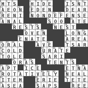 ACROSS 1. Mountains (abbr.) 4. Flintstone garb 8. Is not 12. Period of immesurable duration 14. Paradise 15. Letter starter 16. Painter Guido (1575-1642) 17. Unrelated to defense, as in spending 20. Of or related to the anus 21. "Barney Miller" actor Jack 22. Had dinner 23. Musical pauses 27. Egg locale 29. Baking chamber 31. Protracted 34. Maternal 35. Type of rug 36. Spoken 39. "___ Maria" 41. Russian ruler of old 42. Lacking warmth 43. A salt of uric acid 46. Lacquered or enameled metalware 47. Indian skirt 48. Mouths or openings 51. Portable shelters 54. Fitting 56. Frozen water 58. Inactive volcano in Sicily 61. Producing rotation 66. Anneal 67. Detail 68. One of the Great Lakes 69. False hair 70. Toward the sea 71. Plant excrements 72. To riddle DOWN 1. Hindu Mythology: god of death 2. Adolescent 3. Underwater navigation system 4. Layer 5. Wedding promise 6. Lair 7. Conclusions 8. Binary compound 9. Legislators 10. Political cartoonist Thomas 11. Family _ (genealogy) 13. The longest river in the world 18. A really long time 19. Enemy 24. Male offspring 25. Federal power corp. 26. Bristle 28. Chalkboard 30. Congenital growth or mark on the skin 32. Teachers' org. 33. Slender fish 34. A person who is older than you are 36. Sep. follower 37. Friend of Pooh 38. One to whom something is allotted 40. Part of Q.E.F. 44. "We ___ not amused" (Victoria) 45. Metal container 49. Small island 50. _-fi 52. Portable shelter 53. Guide 54. Roberta Peters solo 55. Plant holders 57. Nights before holidays 59. Nathan's nickname 60. Toward shelter 62. Wet nurse (var.) 63. Epoch 64. Mouth edge 65. Consenting reply
