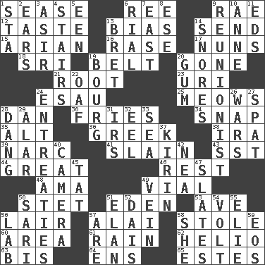 ACROSS 1. Gospel singer Marvin 6. To sift 9. Actress Charlotte 12. Clothes sense 13. Prejudice 14. Post 15. Believer in; advocate of (suffix) 16. To erase 17. Religious women 18. Indian title of respect (Mr.) 19. Waist strap 20. Went 21. Carrot, for example 23. RI univ. 24. He sold his birthright 25. Catcalls? 28. One of the 12 tribes of Israel 30. Strips of potato fried in deep fat 34. Fastener 35. The first octave above the treble staff 36. Of Greece 38. Retirement account (abbr.) 39. Drug cop 41. Killed 43. Fast jet (abbr.) 44. Relatively large 46. Remainder 48. Nanny (var.) 49. Small bottle 50. Proofreading order 51. Genesis locale 53. "___ Maria" 56. Den 57. Jai _ 58. Took without asking 60. Length times width 61. Water falling in drops from the sky 62. Sun: prefix 63. Altar cloth linen 64. Followers of ems 65. _____ Park, CO DOWN 1. R.R. building 2. Hearing organs 3. SW Saudi Arabia district 4. Flight of steps 5. Car or cant ending 6. Monetary unit of Yemen 7. Compass direction 8. Compass dir. 9. One who advocates reunion 10. Singer Murray 11. Begley and Asner 13. Cy Young winner Saberhagen 14. Sounds asleep 19. French market town 20. Chewing product 22. Clumsy lout 24. Pleas 26. Armed conflicts 27. Petty quarrel 28. Mild oath, euphamism for damn 29. Having or resembling wings 31. Big collection agency 32. Snakelike fish 33. Ocean 37. Japanese brewing company 40. Device for capturing images 42. Teachers' org. 45. Make lace 47. Chalkboards 49. Distinctive style or manner 50. Indian skirt 51. Enthusiasm 52. Raised platform 54. Electrical Unit 55. Writer Wiesel 56. Experiment locale 57. "We ___ not amused" (Victoria) 58. A female animal or person 59. Greek goddess of the dawn