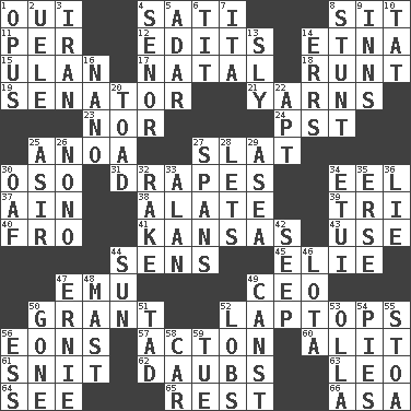 ACROSS 1. Fr. "Yes" 4. Suttee (variant) 8. Be seated 11. For each 12. Proofreads 14. Inactive volcano in Sicily 15. ____ Bator, Mongolia 17. Brizilian seaport 18. Undersized animal 19. Elected representative 21. Entertaining tales 23. And not 24. Pacific Standard Time (abbr.) 25. Small Philippine buffalo 27. Narrow board 30. Bear (Spanish) 31. Window treatments 34. Snakelike fish 37. The 18th letter of the Arabic alphabet 38. Having winglike extensions 39. Three (prefix) 40. Away 41. Sunflower state 43. Purpose 44. Elected reps. 45. Writer Wiesel 47. Australian flightless bird 49. Corporate head (abbr.) 50. Monetary aid 52. Portable computers 56. Immeasurably long periods of time 57. Gambison 60. Came down and settled, as after flight 61. In a ____ (agitated or irritated) 62. Applies to a surface 63. Lion 64. Perceive with the eye 65. Remainder 66. White ___ sheet DOWN 1. Musical composition 2. Ubangi River tributary 3. SW Asia republic 4. Sir (Sp.) 5. The sixth month of the Jewish calendar 6. Teat (slang) 7. Call ___ day 8. Check the growth or development of 9. Restaurants 10. Make lace 13. Playfully artful 14. Blunders 16. Billionth: prefix 20. Frog relative 22. Fitting 25. SW Saudi Arabia district 26. Words to Nanette 27. Connects, as a bridge 28. Allows 29. At sea 30. Clumsy lout 32. Libertine 33. Actor Alda or Thicke 34. Needle holder 35. Celtic language 36. Untruth 42. Ooze 44. Player for Phoenix 46. Globular water bottle used in Asia 47. Bert's buddy 48. Vertical spar for supporting sails 49. 2nd pers. sing. pres. of can (arch.) 50. Went 51. Small amount or degree 52. Tennis shots 53. Water jar 54. Sliced desserts 55. Portico 56. Curvy letter 58. Auto 59. Third day of the wk.