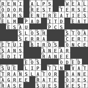 ACROSS 1. Painter Guido (1575-1642) 5. High mountains 9. Welt 13. Aroma 14. Respite 15. Laconic 16. Drinking establishments 17. Pleas 19. Shade tree 20. Groovy apt. 21. It would 22. Erode 23. Son of Isaac 25. Personal Computers (abbr.) 26. Agitate, as a liquid 30. Portico 34. Father Junipero _ 35. Foregone conclusion 36. Needle case 39. Avian creatures 42. Single time 43. Without 44. Approach 46. Prepare for publication 47. Indian princess (variant) 48. Greek goddess of the dawn 51. Wrote a lyric poem 54. Take to court 57. Mouth edge 58. Metal container 60. Large container 62. Interpreter 65. Object of repulsion 66. Match 67. Assign a rank or rating to 68. Lyric poems 69. To erase 70. Takes to court 71. 270 degrees DOWN 1. Loose flowing garment 2. Peak District village in England 3. Typical models 4. Big collection agency 5. Length times width 6. Grant temporary use of 7. Pacific Standard Time (abbr.) 8. Remove all contents or possession from 9. Dripping 10. 4th largest of the Great Lakes 11. Toward the sea 12. For fear that 15. Small amounts or degrees 18. And so on (abbr.) 20. Whimper 24. Aid 27. Globe 28. Indian title of respect (Mr.) 29. Ethiopian city, capital of Harari 30. Tallied 31. "___ Little Indians" 32. The grampus (Milton) 33. Had dinner 36. Compass dir. 37. Bit 38. University (slang) 40. Heredity factor (abbr.) 41. Elected rep. 45. Period of immesurable duration 48. Otherwise 49. Petroleum 50. Practice fights 52. Dodge 53. Natives or inhabitants of Denmark 54. Play the lead 55. Capital and largest city of Mongolia 56. Hearing organs 58. Haul 59. Angers 61. Trial 63. Born 64. The 19th letter of the Greek alphabet 65. Ribbon knot