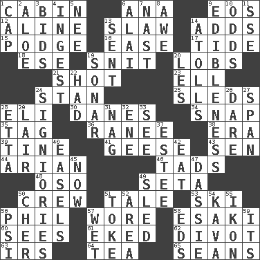ACROSS 1. Small house or cottage 6. Santa ___, CA 9. Greek goddess of the dawn 12. Place in a line 13. Cole _ (cabbage dish) 14. Does sums 15. Porridge 16. Relaxation 17. Periodic rise and fall of the sea level 18. Compass dir. 19. In a ____ (agitated or irritated) 20. Tennis shots 21. Opportunity 23. Pipe bend 24. Comedian Laurel of Laurel & Hardy 25. Bobsleighs 28. Biblical high priest 30. Natives or inhabitants of Denmark 34. Fastener 35. Label 36. The wife of a rajah (variant) 38. Period 39. Prong on a fork 41. Honkers 43. Elected rep. 44. Believer in; advocate of (suffix) 46. Bits 48. Bear (Spanish) 49. Bristle 50. Ship's personnel 51. Falsehood 53. What Jean-Claude Killy likes to do 56. Silvers or Donahue 57. Had on 58. 1973 Nobel Price Winner (Physics) Leo 60. Perceives with the eye 61. Supplemented with great effort 62. A piece of turf (Scot.) 63. Big collection agency 64. Beverage made from leaves 65. Actors Connery and Penn DOWN 1. Head covering 2. _ vera 3. Auction offers 4. Swallow 5. Born 6. Jai ____ 7. Political cartoonist Thomas 8. Deep reverence 9. The property of being fit to eat 10. Probability 11. Compass dir. 13. Emitted 14. Ringlike coral islands and reefs 19. Underwater navigation system 20. French article 22. Possessed 24. Seigniories (variant) 26. Have the gumption 27. Connect, as a bridge 28. Singer James 29. Den 31. Tired old horse 32. Compass dir. 33. Observe 37. First name in cosmetics 40. Artist's stands 42. Consume 45. Immediately 47. Hyrax 49. Downhill vehicle 50. "Mermaids" star 51. Puff or smoke 52. Length times width 54. Polynesian shrub of the pepper family 55. Picture 56. Air pressure measure (abbr.) 57. Soggy 58. Begley and Asner 59. ___ a Wonderful Life