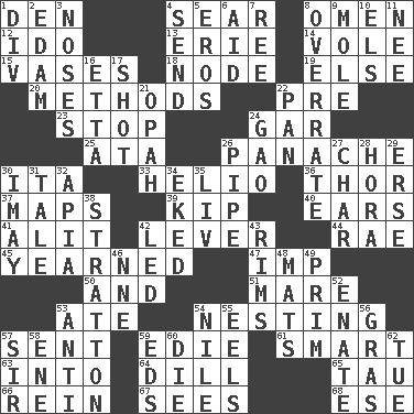 ACROSS 1. Lair 4. Dry up 8. Presage 12. Wedding promise 13. 4th largest of the Great Lakes 14. Short-tailed, large-bodied rat 15. Flower holders 18. Connecting point 19. Otherwise 20. Modes 22. Before (prefix) 23. Halt 24. Slender fish 25. _ moment's notice (2 wds.) 26. Flamboyance 30. Call ___ day 33. Sun: prefix 36. Son of Odin 37. Atlas contents 39. Sleep 40. Hearing organs 41. Came down and settled, as after flight 42. Prying instrument 44. Actress Charlotte 45. Had a strong desire 47. Naughty child 50. Also 51. Female horse 53. Had dinner 54. Inhabiting a nest 57. Transmitted 59. Singer Brickell 61. Don Adams' spy role 63. To the inside or interior of 64. Deli pickle 65. The 19th letter of the Greek alphabet 66. It's straight from the horse's mouth 67. Perceives with the eye 68. Compass dir. DOWN 1. HTML Container Element 2. Dutch treat 3. Olfactory organs 4. Post 5. Greek god of love 6. Assist 7. To riddle 8. Make much ado about nothing 9. Undercover agent 10. Raised railways 11. Born 16. Singer James 17. Guess 21. Brightly colored fish 22. Baking dish 24. E Mali city 26. Corncob 27. Burn to charcoal 28. Israeli folk dance 29. Celtic language 30. "If ____ say so..." 31. Lie 32. Capital of Western Samoa 34. Made supply last 35. 54 in ancient Rome 38. Ski resort town in Vermont 42. Directed 43. Basketball hoops 46. Compass dir. 48. Floor protectors 49. Demure 52. Maternal 53. Opposed to 54. Mediterranean tributary 55. Snakelike fish 56. Pate de foie ____ 57. Title for a knight 58. Compass dir. 59. Begley and Asner 60. Expire 62. Third day of the wk.