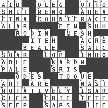 ACROSS 1. Help 4. Cassini of fashion 8. Von Bismarck 12. In a ____ (agitated or irritated) 14. San ____ (Riviera town) 15. Type of rug 16. Inactive volcano in Sicily 17. Act in opposition 20. Having or resembling wings 21. Car or cant ending 22. Quiet! 23. "The Thinker" sculptor 27. Soft 29. Detail 31. Land measure 34. Memphis, Tenn. Street 35. Ketch in the Levant 36. Fly high 39. Chop off 41. _ china 42. Competent 43. Make _____ (do battle with) 46. Light colored 47. Indian titles of respect 48. Lyric poems 51. Woman's close-fitting hat 54. Nonscientific branch of learning 56. "We ___ not amused" (Victoria) 58. Political cartoonist Thomas 61. Producing rotation 66. Austrian river, tributary to the Danube 67. To starve (Brit.) 68. 4th largest of the Great Lakes 69. False hair 70. Ooze 71. Plant excrements 72. Falsehood DOWN 1. At sea 2. International (abbr.) 3. Middle Eastern gold or silver currency 4. The grampus (Milton) 5. Lion 6. Australian flightless bird 7. Went 8. Rowing implement 9. File 13 10. Technician 11. Pledge 13. Edible starchy tuberous root 18. "___ Little Indians" 19. Compass dir. 24. Pass on 25. Call ___ day 26. 1994 drama film starring Jodie Foster 28. Indian antelope 30. Catcalls? 32. To free from 33. Environmental prefix 34. A special lineage 36. Plant excrement 37. Chief or king in Benin or Nigeria 38. One to whom something is allotted 40. Piece 44. _ de Janeiro 45. Bear (Spanish) 49. Erode 50. Indian title of respect (Mr.) 52. A single undivided whole 53. Artist's stand 54. Arches 55. Hero or heavy, e.g. 57. Nights before holidays 59. Suttee (variant) 60. Relationship diagram 62. Electrical Unit 63. Period 64. Mouth edge 65. Consenting reply