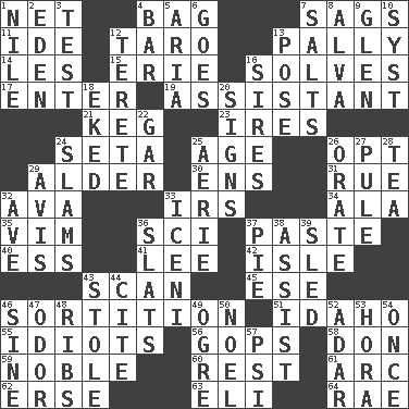 ACROSS 1. Fish or hair follower 4. Container for groceries 7. Droops 11. Binary compound 12. Edible starchy tuberous root 13. Friendly 14. French article 15. 4th largest of the Great Lakes 16. Finds the solution 17. Keyboard key 19. Helper 21. Barrel 23. Angers 24. Stalk of a moss capsule 25. Grow older 26. Elect 29. Tree or shrub in the Birch family 30. Followers of ems 31. Regret 32. Actress Gardner 33. Big collection agency 34. Insect wing 35. Zeal 36. _-fi 37. Thick mixture 40. Double-curved letter 41. Area sheltered from the wind 42. Small island 43. Examine minutely or intensely 45. Compass dir. 46. Decision 51. Potato state 55. Foolish or stupid persons 56. Republicans 58. Spanish title 59. Impressive in appearance 60. State of inaction 61. Curve 62. Celtic language 63. Connecticut Ivy Leaguer 64. Actress Charlotte DOWN 1. The longest river in the world 2. Paradise 3. Trial 4. Oblong piece of solid material 5. Roberta Peters solo 6. Leaves 7. Table seasonings 8. Inventor's middle name 9. Small, secluded valley 10. System (abbr.) 12. Cylindrical with tapered ends 13. Introduce or present, as a question 16. Fathers 18. Made supply last 20. Omens 22. Slender fish 24. Shuts with force 25. Nest on high 26. Declaim 27. Whine 28. Afternoon social gathering 29. Deliberation 32. "___ Maria" 33. Ancient Celtic tribe of eastern Britain 36. Narrow boards 37. Sliced dessert 38. Aid 39. Downhill vehicle 43. Took without asking 44. Quote 46. Trig term 47. Scent 48. Teases 49. Legendary monster 50. Christmas carol 52. The sixth month of the Jewish calendar 53. Israeli folk dance 54. Single time 57. Air pressure measure (abbr.)