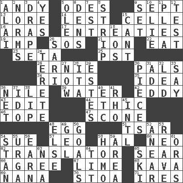 ACROSS 1. Actor Griffith 5. Lyric poems 9. Back-to-school mo. 13. Old wives' tales, e.g. 14. For fear that 15. Cell (Danish) 16. Caspian sea tributary 17. Pleas 19. Mischievous child 20. Distress signal 21. Electrically charged atom 22. Ingest 23. Bristle 25. Pacific Standard Time (abbr.) 26. Bert's buddy 30. Friends 34. Disturbances 35. The main thing one is thinking about 36. "Death on the ____" 39. Wetness 42. Whirlpool 43. Prepare for publication 44. Principle of right and wrong 46. Drink excessively 47. Biscuitlike quick bread 48. Oval reproductive body of a fowl 51. Russian ruler of old 54. Institute legal proceedings 57. Lion 58. Actor Linden 60. Modern: prefix 62. Interpreter 65. Burn superficially 66. Match 67. Welles in "The Third Man" 68. Polynesian shrub of the pepper family 69. Grandmother 70. Portico 71. Angers DOWN 1. Jai ____ 2. Typical standards 3. Window treatment 4. Consenting reply 5. Margarine 6. Hiding places for outlaws 7. Eastern Standard Time (abbr.) 8. Remove all contents or possession from 9. Put into a specified state 10. Writer Wiesel 11. Entreaty 12. Trial 15. Patter 18. Greek goddess of the dawn 20. Indian skirt 24. Cigar-shaped 27. At this time 28. Call ___ day 29. _____ Park, CO 30. Components 31. Increase 32. Directed 33. Declare 36. Fish or hair follower 37. Wedding promise 38. Mouth edge 40. And so on (abbr.) 41. 17th letter of the Greek alphabet 45. International (abbr.) 48. Otherwise 49. Set 50. Purposes of endeavors 52. Approach 53. Break or tear apart 54. Comedian Laurel of Laurel & Hardy 55. Capital and largest city of Mongolia 56. Merit 58. Like (prefix) 59. Type of rug 61. Mouths or openings 63. Teachers' org. 64. Teat (slang) 65. What Jean-Claude Killy likes to do