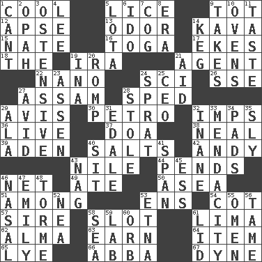 ACROSS 1. Calm and collected 5. Louse (plural) 9. Small child 12. Domed church section 13. Aroma 14. Polynesian shrub of the pepper family 15. Nathan's nickname 16. Ancient Roman robe 17. Makes supply last 18. Definite Article 19. Retirement account (abbr.) 21. Representative 22. Billionth: prefix 24. _-fi 26. Compass dir. 27. Indian state 28. Broke a traffic law 29. Opinion 30. Stone: prefix 32. Naughty children 36. Moving, as bait 37. ___ good deed 38. Anneal 39. Arabian gulf 40. Table seasonings 42. "60 Minutes" Commentator Rooney 43. "Death on the ____" 44. Depends 46. Fish or hair follower 49. Had dinner 50. At sea 51. Amid 53. Followers of ems 54. Small bed 57. Title for a man of rank and authority 58. Position in a hierarchy or organization 61. Pale green bean 62. _ mater 63. Merit 64. Detail 65. Potassium hydroxide 66. Swedish rock group 67. Unit of force DOWN 1. Patter 2. Brightly colored fish 3. Clearly or manifestly demonstrative 4. Area sheltered from the wind 5. Globular water bottle used in Asia 6. Wedding promise 7. Gear tooth 8. Epoch 9. Receives possession of 10. Baking chambers 11. Clothes sense 14. Barrel 19. _ tizzy (2 wds.) 20. Play 21. Assist 23. NE Netherlands city 24. Small fatty European fish 25. Corporate head (abbr.) 27. Enthusiastic 28. Fur scarf 29. Wing 31. Peak District village in England 32. Silly 33. Ananias' fault 34. Groovy apts. 35. Cunning 40. Be seated 41. Connect, as a bridge 43. Tired old horse 45. Curvy letter 46. Relating to the nose 47. Poet Dickinson 48. Singer Mel 52. Teachers' org. 53. Inactive volcano in Sicily 55. Sign of things to come 56. Not wild 58. Ocean 59. Experiment locale 60. Globe 61. Hat (slang)