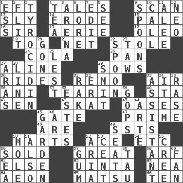ACROSS 1. Lizard (obsolete) 4. Falsehoods 9. Glance over 13. Wily 14. Eat (away) 15. Diluted with white 16. Title for a knight 17. Nest on high 18. Butter sub 19. Coat; cloak 21. Remaining after all deductions 22. Took without asking 24. Root beer relative 26. Baking dish 27. Place in a line 29. Sty mamas 30. Amusement-park features 31. San ____ (Riviera town) 33. Atmosphere 36. Black tropical American cuckoo 37. Pulling apart 40. R.R. building 41. Elected rep. 42. Three-handed card game 43. Fertile tracts in a desert 45. Yard entry 47. First class 48. "We ___ not amused" (Victoria) 49. Fast planes 50. Shops 52. Adept person 54. And so on (abbr.) 56. Exchanged or delivered for money 57. Relatively large 59. Sandy's bark 61. Otherwise 62. National forest in Provo, Utah 63. Teachers' org. 64. Age 65. Taiwanese island in East China Sea 66. "___ Little Indians" DOWN 1. Double-curved letter 2. Secret move to avoid paying debts 3. Polypeptide antibiotic 4. Beverage made from leaves 5. Sports stadium 6. Old wives' tales, e.g. 7. Prepare for publication 8. Observe 9. Soup utensils 10. Give a ring to 11. Toward shelter 12. Modern: prefix 20. Went 22. Soup utensil 23. The 23rd letter of the Hebrew alphabet 25. For fear that 27. Caspian sea tributary 28. Actor's bit 29. Stricken, poetically 31. Immoral or dissolute person 32. Period 33. Aide 34. Detail 35. Raze (variant) 38. _____ Park, CO 39. Republicans 44. Johnson of "Laugh-In" 45. Place where plants grow 46. Tate display 49. Theater features 50. Undercover agent 51. In addition 52. Roberta Peters solo 53. Penny 55. Algonquian 56. Ocean 57. Chewing product 58. The 19th letter of the Greek alphabet 60. Avid follower