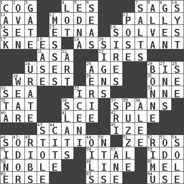 ACROSS 1. Gear tooth 4. French article 7. Sinks 11. Actress Gardner 12. Method 13. Friendly 14. Arrange properly for use 15. Inactive volcano in Sicily 16. Finds the solution 17. Leg joints 19. Helper 21. White ___ sheet 23. Angers 24. One who uses or employs something 25. Grow older 26. Twice 29. Obtain by seizing forcibly or violently 30. Followers of ems 31. Single 32. Ocean 33. Big collection agency 34. Compass dir. 35. Make lace 36. _-fi 37. Connects, as a bridge 40. "We ___ not amused" (Victoria) 41. Area sheltered from the wind 42. Court order 43. Examine hastily 45. Ending with capital 46. Drawing lots 51. Nothings 55. Foolish or stupid persons 56. Slanted text style (abbr.) 58. Wedding promise 59. Having high moral qualities 60. Actor's bit 61. Cartoonist voice _ Blanc 62. Celtic language 63. Compass dir. 64. Purpose DOWN 1. Keg 2. Baking chamber 3. Yard entry 4. Car dealer's back yard 5. Pulitzer Prize-winning author Ferber 6. Oceans 7. Table seasonings 8. Inventor's middle name 9. Small, secluded valley 10. System (abbr.) 12. Makes clutter 13. Introduce or present, as a question 16. Founders of families 18. Relaxation 20. Attaches a signature 22. Nonscientific branch of learning 24. A salt of uric acid 25. Nest on high 26. Maid-servant 27. Restaurants 28. Perceive with the eye 29. Erode 32. R.R. building 33. Ancient Celtic tribe of eastern Britain 36. Narrow boards 37. _ Lanka 38. Answer to "Whatcha doin'?" 39. Toward shelter 43. Fur scarf 44. Quote 46. Trig term 47. Aroma 48. Teases 49. Petroleums 50. Nuclear Threat Initiatives 52. Tall New Zealand timber tree 53. Lyric poems 54. Not divided or shared with others 57. One (Scot)