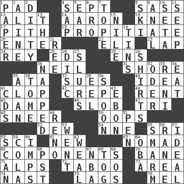 ACROSS 1. Groovy apt. 4. Back-to-school mo. 8. Backtalk 12. Set down 14. Composer Copland 16. Leg joint 17. Heart or essence 18. Appease 20. Keyboard key 22. Biblical high priest 23. Pet locale 24. Marina Del _, California 25. Begley and Asner 28. Followers of ems 30. Famous astronaut Armstrong 31. Dinah or Pauly 35. _ moment's notice (2 wds.) 37. Institutes legal proceedings 40. It may be bright or harebrained 41. Hoof sound 42. Streamer paper 44. Monthly bill 45. Moist 46. Messy guy 47. Three (prefix) 48. Scornful expression 50. I made a mistake 52. Morning condensation 54. Compass dir. 55. _ Lanka 58. _-fi 61. ___ Haven, CT 63. Roamer 65. Parts 70. Object of repulsion 71. High mountains 72. Off limits 73. Length times width 74. Political cartoonist Thomas 75. Straggles 76. Cartoonist voice _ Blanc DOWN 1. Some stationery 2. Place in a line 3. Short, simple song 4. Plant excrement 5. Hearing organ 6. Adept person 7. Drink excessively 8. What Jean-Claude Killy likes to do 9. Of or related to the anus 10. Bristle 11. Ooze 13. Definite Article 15. "Death on the ____" 19. Canisters 21. To sift 26. Plate 27. Disparaging remarks 29. Upper-body garments 30. Slept 32. River in Europe 33. Painter Guido (1575-1642) 34. Consume 35. ____ Jay Lerner 36. Heavy book 38. Snakelike fish 39. Soup utensil 41. Music discs 43. Inky black, to poets 49. Former U.S. Attorney General Janet 51. Animal enclosure 53. Left 55. Excessive but superficial compliments 56. The wife of a rajah (variant) 57. Perfect 58. Examine hastily 59. Root beer relative 60. Naughty children 62. Welt 64. Chief or king in Benin or Nigeria 66. Pacific Standard Time (abbr.) 67. Basketball assoc. 68. Coat; cloak 69. Distress signal