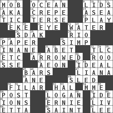ACROSS 1. Disorderly crowd 4. Sea 9. Flaplike coverings 13. Alias (abbr.) 14. Streamer paper 15. Toward the sea 16. Nervous spasm 17. Laconic 18. Live dramatic performance 19. Make supply last 21. Sight organ 22. Wetness 24. Neighbor of Neb. 26. River (Sp.) 27. Some stationery 29. Simple or foolish person 30. Lacking in sense or substance 31. Collude with 33. Affectionate concern, for short 36. And so on (abbr.) 37. Moved like an arrow 40. Friend of Pooh 41. Compass dir. 42. Age 43. Standard of perfection 45. Drinking establishments 47. Climbing, woody, usually tropical vines 48. A saturated hydrocarbon 49. Downhill vehicle 50. Of or pertaining to a thread or threads 52. Actor Linden 54. Madame (abbr.) 56. Mail 57. Utah city north of Ogden 59. Binary compound 61. Charged atoms 62. Bert's buddy 63. 54 in ancient Rome 64. Singer James 65. Inhabitant of Heaven 66. Area sheltered from the wind DOWN 1. Floor covering 2. Migrant worker of the '30s 3. Keyboard key 4. Sep. follower 5. Small stream 6. Suggestive of the supernatural 7. Domed church section 8. Born 9. Portable computer 10. Small island 11. Letter starter 12. Declare 20. Genesis locale 22. Compose 23. Direct toward a target or goal 25. Length times width 27. Sliced desserts 28. Pismires 29. Stitched 31. Ancient Greek god of war 32. Surprise greeting 33. Excercise machine 34. Grant temporary use of 35. Root beer relative 38. Less widely known 39. Deli pickle 44. South Vietnam president (1954) 45. Greek mezzo-soprano Agnes 46. Santa ___, CA 49. Killed 50. Pick up the tab 51. Is not 52. Israeli folk dance 53. Hindu god of fire 55. Singer Brickell 56. Sliced dessert 57. French article 58. Remaining after all deductions 60. First lady
