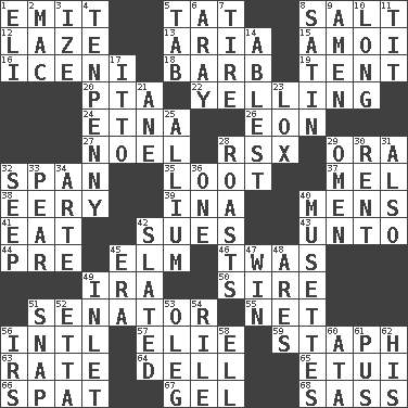 ACROSS 1. Send forth 5. Make lace 8. Table seasoning 12. Goldbrick 13. Operatic vocal solo 15. Mine, in Marseilles 16. Ancient Celtic tribe of eastern Britain 18. Sharp remark 19. Portable shelter 20. Parent Teacher Assoc. 22. Crying or shouting loudly 24. Inactive volcano in Sicily 26. Period of immesurable duration 27. Christmas carol 28. Acura sports coupe 29. Mouth or opening 32. Connect, as a bridge 35. Spoils 37. Cartoonist voice _ Blanc 38. Suggestive of the supernatural 39. _ tizzy (2 wds.) 40. Not women's 41. Erode 42. Takes to court 43. To (old English) 44. Before (prefix) 45. Shade tree 46. It was, poetically 49. Lyricist Gershwin 50. Father 51. Elected representative 55. Remaining after all deductions 56. International (abbr.) 57. Writer Wiesel 59. Staphylococcus 63. Assign a rank or rating to 64. Small valley 65. Needle holder 66. Petty quarrel 67. Set 68. Backtalk DOWN 1. Biblical high priest 2. Apple computer (short form) 3. Ending with capital 4. 3-inch nail 5. Keyboard key 6. Like ___ of sunshine 7. Hoop that covers a wheel 8. Smooth fabric 9. So be it 10. Yearn 11. Teat (slang) 14. Most capable 17. "Tell ____ the Marines!" 21. A saturated hydrocarbon 23. Brine-cured salmon 25. Plant genus of onion and garlic 28. Ridicules or criticizes harshly 29. Sign of things to come 30. Monthly bill 31. In addition 32. Ooze 33. Lightbulb-shaped fruit 34. Johnson of "Laugh-In" 36. Single 40. French bagpipes 42. Scheduled 45. Period 47. Victory 48. Ancient Greek god of war 49. An arm off of a larger body of water 51. Fastener 52. Singer James 53. Cassini of fashion 54. Cause heat under the collar 56. Big collection agency 58. Pipe bend 60. "One Day ___ Time" 61. Fluid product of inflammation 62. Part of HMS, perhaps