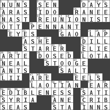 ACROSS 1. Religious women 5. Elected rep. 8. 24-hour periods 12. Ancient river in northeast Turkey 13. Wedding promise 14. The wife of a rajah (variant) 15. Political cartoonist Thomas 16. One who advocates reunion 19. Baseball player Mel 20. Pre-World Series prize 21. Snake ____ (dice throw) 23. E Mali city 24. Pet locale 27. American tennis player Robert 30. Deli pickle 31. A viewer who gazes fixedly 34. Writer Wiesel 35. Johnson of "Laugh-In" 38. Administered medicine 40. Globular water bottle used in Asia 41. Actress Patricia 42. Moe Howard, for one 44. Pismires 45. Table seasoning 46. Cards in a Roman deck? 47. "We ___ not amused" (Victoria) 50. Snakelike fish 53. Of or relating to Laos or its people 57. Hearing organ 59. The property of being fit to eat 63. Suttee (variant) 64. Damascus' land 65. One (Scot) 66. Baby bed with high sides 67. Oceans 68. R.R. building 69. Taverns DOWN 1. Billionth: prefix 2. A salt of uric acid 3. Smutty 4. Fast jet (abbr.) 5. Male parent of an animal 6. Genesis locale 7. Part of speech 8. Daniel's nick name 9. Cuckoo 10. Consenting reply 11. Arrange properly for use 14. Printing process, for short 17. Tired old horse 18. _ tizzy (2 wds.) 20. Inconspicuous attention getter 22. Artist's stands 24. _ and Stitch 25. Set down 26. Entreaty 28. Possessed 29. Greek god of love 30. Keyboard key 32. Eastern Standard Time (abbr.) 33. Vintage cars 35. Of or related to the anus 36. Painter Guido (1575-1642) 37. Jacques of French films 39. ___ good deed 43. Small, secluded valley 47. Silent film actress Nazimova 48. Actress Charlotte 49. A really long time 51. Memorize 52. Smooth fabric 54. Afternoon social gatherings 55. Is not 56. Toward the sea 58. Teases 59. Double-curved letter 60. Color 61. Retirement account (abbr.) 62. Twice 63. _-fi