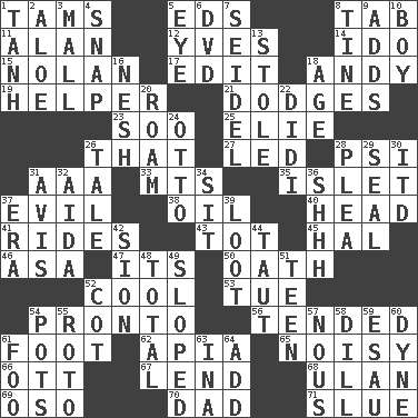 ACROSS 1. Scottish caps 5. Begley and Asner 8. Keyboard key 11. Actor Alda or Thicke 12. Jacques Cousteau's middle name 14. Wedding promise 15. Pitcher Ryan 17. Prepare for publication 18. "60 Minutes" Commentator Rooney 19. Assistant 21. Evades 23. "Barney Miller" actor Jack 25. Writer Wiesel 26. Not this but _ 27. Directed 28. 23rd letter of the Greek alphabet 31. Auto club (abbr.) 33. Mountains (abbr.) 35. Small island 37. Tending to cause great harm 38. Petroleum 40. Froth on beer 41. Amusement-park features 43. Small child 45. Actor Linden 46. White ___ sheet 47. ___ a Wonderful Life 50. Pledge 52. Calm and collected 53. Third day of the wk. 54. Right away 56. Looked after 61. 12 inches 62. Capital of Western Samoa 65. Annoyingly loud 66. Baseball player Mel 67. Grant temporary use of 68. ____ Bator, Mongolia 69. Bear (Spanish) 70. June honoree 71. Change direction abruptly DOWN 1. Hyperbolic tangent 2. _ vera 3. Shopping center 4. Fastener 5. Sight organ 6. Movie disc 7. Beer mug 8. Prong on a fork 9. Does sums 10. Male child 13. Fur scarf 16. Soft 18. Mature 20. Wander 22. "You Light Up My Life" star Conn 24. "Beetle Bailey" pooch 26. Lie 28. Entreaty 29. Lick closed 30. It would 31. Advice 32. Opera by Verdi 34. Be seated 36. Quiet! 37. Epoch 39. Plunder 42. The Jewish people; Israel 44. Pulled tight 48. "_____ Recall" 49. Slanted 51. Adolescent 52. Small bed 54. Plant holders 55. Printing process, for short 57. Horse sense 58. Deli pickle 59. Son of Isaac 60. Centimeter-gram-second unit of force 61. Egg _ yung 63. _ tizzy (2 wds.) 64. Say or write further