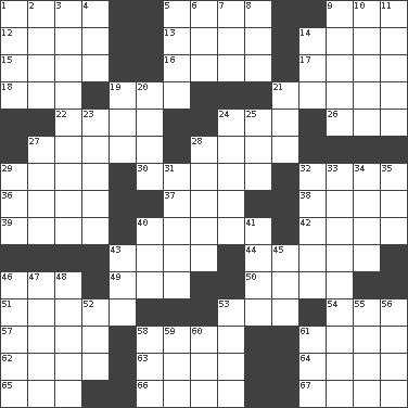 ACROSS 1. Mail 5. Coral collection 9. Chewing product 12. Russian composer Stravinsky 13. South American Indian 14. Operatic vocal solo 15. Suggestive of the supernatural 16. A really long time 17. Emitted 18. Arrange properly for use 19. Leather borer 21. Arguments over trivial matters 22. "Tell ____ the Marines!" 24. Be seated 26. The 19th letter of the Greek alphabet 27. Bull 28. Roll call or roster of names 29. Den 30. Vices 32. Measure of real estate 36. Greek god of love 37. Working for oneself (abbr.) 38. Part of Q.E.F. 39. Prong on a fork 40. Columnist Joseph or Stewart 42. College mil. group 43. "Death on the ____" 44. Ascend 46. Fish or hair follower 49. _ moment's notice (2 wds.) 50. Institutes legal proceedings 51. Amid 53. A female animal or person 54. Armed conflict 57. The founder of a family 58. Sharp bark 61. Short-tailed, large-bodied rat 62. _ mater 63. Writer Wiesel 64. SW Asia republic 65. Potassium hydroxide 66. Downhill vehicle 67. Prepare for publication DOWN 1. Sliced desserts 2. Double curve, resembling the letter S 3. Casting lots 4. Attempt 5. Monetary unit of Yemen 6. Compass dir. 7. Environmental prefix 8. Avid follower 9. Relatively large 10. National forest in Provo, Utah 11. Taiwanese island in East China Sea 14. Viper 19. Had dinner 20. Had on 21. R.R. building 23. Laconic 24. Twentieth part of a lira 25. ___ a Wonderful Life 27. Indian skirt 28. Remove soap 29. Allow 31. Country residence 32. Nest on high 33. What you're doing now 34. Pace 35. And so on (abbr.) 40. Small island 41. Romantic infatuation 43. Tired old horse 45. Sorrow 46. Relating to the nose 47. Poet Dickinson 48. Singer Mel 52. Teachers' org. 53. Drove too fast 55. Jai _ 56. Monthly bill 58. Consenting reply 59. Pipe bend 60. Whopper 61. Compete