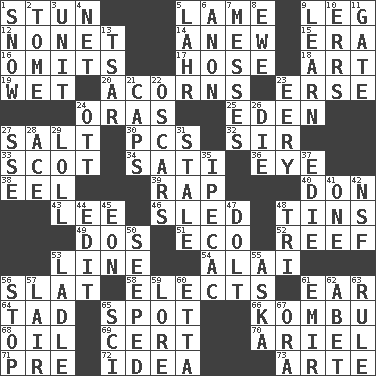 ACROSS 1. Astound 5. Unable to walk 9. Part of a journey 12. Music written for nine 14. Afresh 15. Period 16. Leaves out 17. Stockings 18. Nonscientific branch of learning 19. Soggy 20. Oak nuts 23. Celtic language 24. Mouths or openings 25. Genesis locale 27. Table seasoning 30. Personal Computers (abbr.) 32. Title for a knight 33. Native of Scotland 34. Suttee (variant) 36. Sight organ 38. Snakelike fish 39. Reproach for some lapse or misdeed 40. Spanish title 43. Area sheltered from the wind 46. Downhill vehicle 48. Airtight sealed metal containers 49. Two (Sp.) 51. Environmental prefix 52. Coral ridge 53. Actor's bit 54. Jai _ 56. Narrow board 58. Opts 61. Ewer handle 64. Bit 65. Specific locale 66. Dried seaweed eaten as food 68. Petroleum 69. Certainty 70. Satellite of Uranus 71. Before (prefix) 72. It may be bright or harebrained 73. Johnson of "Laugh-In" DOWN 1. Overwhelm 2. Heavy book 3. A single undivided whole 4. Remaining after all deductions 5. Cowardly lion portrayer 6. Soon (poet.) 7. Makes clutter 8. She-sheep 9. Memorize 10. Blunders 11. Yard entry 13. Russian ruler of old 21. Balmoral and tarboosh 22. Motion picture awards 23. Suggestive of the supernatural 24. Baseball player Mel 26. Expire 27. Compass dir. 28. Adept person 29. Hang loosely or laxly 31. Having lost freshness 35. Medicinal drug used to evoke vomiting 37. Singer Brickell 41. Single 42. Overdraft (abbr.) 44. Prepare for publication 45. A really long time 47. Stupid person 48. Three (prefix) 50. Oozed 53. Dipping utensil 55. "____ silly question..." 56. Cease 57. Den 59. Old wives' tales, e.g. 60. Singer James 61. Arab leader 62. Collude with 63. General guideline 65. _-fi 67. Mouth or opening
