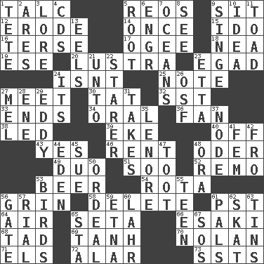 ACROSS 1. Baby powder 5. Vintage cars 9. Be seated 12. Eat (away) 14. At one time in the past 15. Wedding promise 16. Laconic 17. Double curve, resembling the letter S 18. Teachers' org. 19. Compass dir. 20. A period of five years 23. Mild oath 24. Is not 25. Musical sound 27. Confront 30. Make lace 32. Fast jet (abbr.) 33. Extremities 34. Taken by mouth 36. Air blower 38. Directed 39. Make supply last 40. Not in operation 43. Consenting reply 46. Monthly bill 48. Baltic tributary 49. Superhero pair 51. "Barney Miller" actor Jack 52. San ____ (Riviera town) 53. Fermented drink made from hops 54. Roll call or roster of names 56. Broad smile 58. Keyboard key 61. Pacific Standard Time (abbr.) 64. Atmosphere 65. Stalk of a moss capsule 66. 1973 Nobel Price Winner (Physics) Leo 68. Small boy 69. Hyperbolic tangent 70. Pitcher Ryan 71. Raised railways 72. Having or resembling wings 73. Fast planes DOWN 1. False hair 2. Ancient Greek god of war 3. Old wives' tales, e.g. 4. Music discs 5. Carrot, for example 6. Engineer (abbr.) 7. Seas 8. Perceive with the eye 9. Scorch 10. The main thing one is thinking about 11. Frog relative 13. Snakelike fish 21. To (old English) 22. A viewer who gazes fixedly 23. Singer James 24. It is 26. Order of Saint Francis (abbr.) 27. Cartoonist voice _ Blanc 28. Compass dir. 29. Whirlpool 31. Proceeds 35. Poe poem 37. Thickened enlargement 41. Opposite of masc. 42. Back 44. Genesis locale 45. Take to court 47. A blast of a horn 48. Mouth or opening 50. Severe or trying experience 53. Avian creatures 55. Adolescent 56. Yard entry 57. Monetary unit of Yemen 59. Inactive volcano in Sicily 60. Cowardly lion portrayer 61. Friends 62. Three-handed card game 63. Airtight sealed metal containers 65. R.R. building 67. Mayday