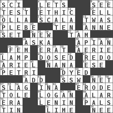 ACROSS 1. _-fi 4. Allows 8. Observe 11. Trial 13. Principle of right and wrong 15. Pipe bend 16. Spanish pot 17. Any of the three canals of the cochlea 18. It was, poetically 19. Military trainee 21. Nine, plus one 22. Queen of England 1702-14 23. Put into a specified state 24. ___ Haven, CT 27. Scottish cap 29. "____ silly question..." 30. Bee-related 34. Opposite of masc. 36. Part of Q.E.F. 39. Nest on high 40. Desk light 41. Administered medicine 43. Make new 44. Satellite of Uranus 46. Grandmother 47. Compass dir. 48. _ dish (used to culture cells) 49. Colored 51. Increase 53. Compass dir. 54. Fish or hair follower 57. Volcanic refuse 60. _ tizzy (2 wds.) 63. Eat (away) 65. Lacquered or enameled metalware 66. Utah city north of Ogden 69. Having or resembling wings 70. Period 71. Soviet premier 1918-24 72. Friends 73. Metal container 74. Citrus frut 75. Born DOWN 1. Halts 2. Cell (Danish) 3. Small island 4. French article 5. And so on (abbr.) 6. Not this but _ 7. Drop; flow; fall 8. Stitched 9. Liveliness 10. Otherwise 12. Bar bill 14. Patter 18. ________ with (broke a safety seal) 20. Followers of ems 25. Made supply last 26. Make _____ (do battle with) 28. Auto club (abbr.) 29. Electrical Measurement 31. Angers 32. Assistant 33. Modern: prefix 34. Conductor's collection 35. Give off 37. White ___ sheet 38. Watches over 40. Infant locale 42. 24-hour periods 45. Flaplike covering 50. She-sheep 52. Deli pickle 54. Pitcher Ryan 55. Peak District village in England 56. Laconic 57. Proofreading order 58. Australian parrot (variant) 59. ____ Jay Lerner 61. Christmas carol 62. Hindu god of fire 64. Strike 67. Direct toward a target or goal 68. Compass dir.