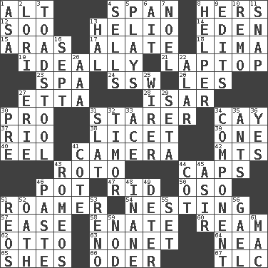 ACROSS 1. Keyboard modifier key 4. Connect, as a bridge 8. Possessive pronoun 12. "Barney Miller" actor Jack 13. Sun: prefix 14. Genesis locale 15. Caspian sea tributary 17. Having winglike extensions 18. Pale green bean 19. Under perfect conditions 21. Portable computer 23. Health resort 24. Compass dir. 26. French article 27. Singer James 28. Austrian river, tributary to the Danube 30. Adept person 31. A viewer who gazes fixedly 34. Island 37. River (Sp.) 38. It is permitted: Lat. 39. Single 40. Snakelike fish 41. Device for capturing images 42. Mountains (abbr.) 43. Printing process, for short 44. Smile enhancers 46. Cooking vessel 47. To free from 50. Bear (Spanish) 51. Wanderer 54. Inhabiting a nest 57. Comfort 58. Maternal 60. 480, 500 or 516 sheets of paper 62. Von Bismarck 63. Music written for nine 64. Teachers' org. 65. "______ My Girl" (Turtles hit) 66. River in Europe 67. Affectionate concern, for short DOWN 1. White ___ sheet 2. Australian parrot (variant) 3. Inedible or poisonous agaric 4. Makes a sale 5. Frolics 6. Small island 7. Christmas carol 8. Assistant 9. Proofreads 10. San ____ (Riviera town) 11. Fastener 13. Actor Linden 16. Back-to-school mo. 20. American Automobile Association (abbr.) 22. Having or resembling wings 25. One who wires 27. 4th largest of the Great Lakes 29. Stalk of a moss capsule 30. Before (prefix) 31. Narrow board 32. The easternmost of the Lesser Sundas 33. Adept person 34. Piece 35. Pismires 36. Consenting reply 41. ____ d'Azur (French Riviera) 43. Lover boys 44. Small bed 45. SW Saudi Arabia district 46. Thick mixture 48. Silly 49. Prevent from occurring 51. Vintage cars 52. Pledge 53. Western Nevada city 55. Put into a specified state 56. Highlander 59. Dreamland 61. Apple computer (short form)