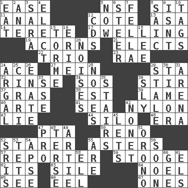 ACROSS 1. Comfort 5. Science/research agcy. 8. Be seated 11. Of or related to the anus 12. ____ d'Azur (French Riviera) 13. White ___ sheet 14. Cigar-shaped 17. Home 19. Oak nuts 21. Opts 22. Musical group of three 23. Actress Charlotte 24. Adept person 27. Count _ (2 wds.) 29. R.R. building 32. Wash lightly 34. Distress signal 36. Disorderly outburst 37. Pate de foie ____ 38. Eastern Standard Time (abbr.) 39. Unable to walk 40. Johnson of "Laugh-In" 41. Ocean 42. Thermoplastic polyamide 43. Falsehood 44. Grain storage tower 46. Period 47. Parent Teacher Association (abbr.) 50. Western Nevada city 52. A viewer who gazes fixedly 55. Michaelmas daisies 57. News announcer 59. Moe Howard, for one 62. It is 63. Filth; sediment 64. Christmas carol 65. Observe 66. Snakelike fish 67. Washington bills DOWN 1. Ingest 2. A saturated hydrocarbon 3. "Two Mules for Sister ____" 4. Voters do this 5. At this time 6. Bull 7. Chap (slang) 8. Ketch in the Levant 9. Is not 10. Labels 12. Music discs 15. Singer Mel 16. 4th largest of the Great Lakes 18. Area sheltered from the wind 20. Annoying sounds 24. Therefore, facetiously 25. High-altitude cloud 26. Maternal 28. Olfactory organs 29. Lacking originality or spontaneity 30. The easternmost of the Lesser Sundas 31. Sports stadium 33. Compass dir. 35. Flight of steps 36. Roguish 42. Music written for nine 45. Allows 47. Adept person 48. Laconic 49. Nick name for Arthur 51. U. of Maine site 52. Indian titles of respect 53. Wig 54. Domed church section 55. "We ___ not amused" (Victoria) 56. Within a short period 58. Pipe bend 60. Turn to the right 61. Raised railways